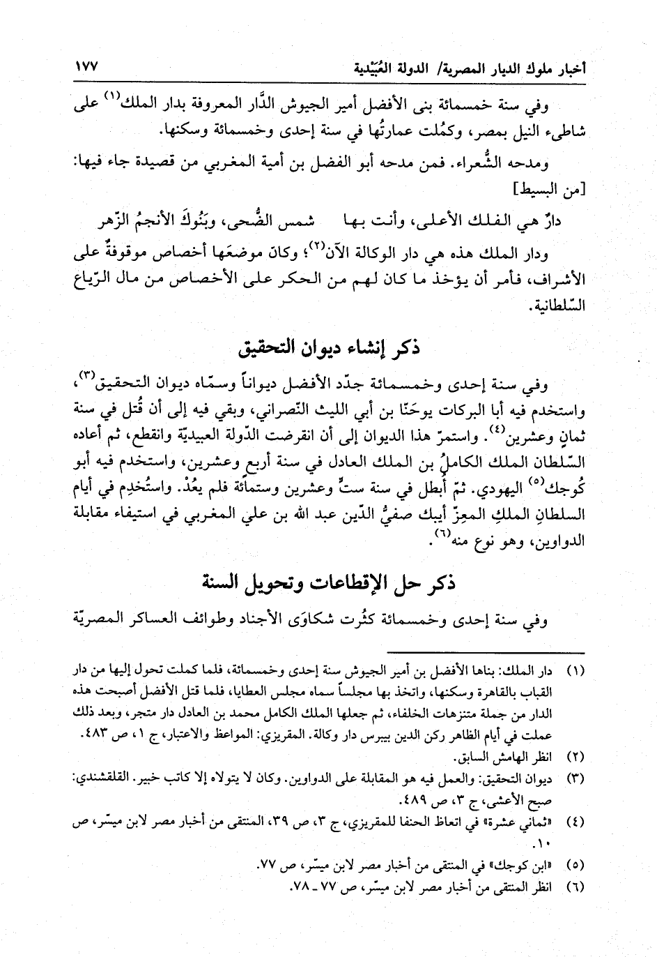 وفي سنة إحدى وخمسمائة جدد الأفضل ديواناً وسماه ديوان التحقيق ، واستخدم فيه أبا البركات يوحنا بن أبي الليث النصراني ، وبقي فيه إلى أن قتل في سنة ثمان وعشرين . واستمر هذا الديوان إلى أن انقرضت الدولة العبيدية وانقطع ، ثم أعاده السلطان الملك الكامل بن الملك العادل في سنة أربع وعشرين ، واستخدم فيه أبو كوجك اليهودي . ثم أبطل في سنة ست وعشرين وستمائة فلم يعد . واستخدم في أيام السلطان الملك المعز أيبك صفي الدين عبد الله بن علي المغربي في استيفاء مقابلة الدواوين ، وهو نوع منه .