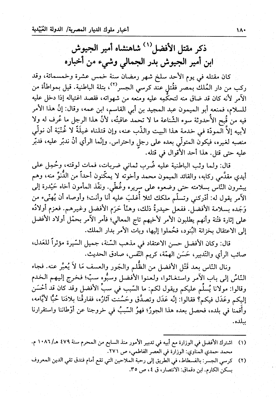 قال : وكان الأفضل حسن الإعتقاد في مذهب السنة ، جميل السيرة ، مؤثراً للعدل ، صائب الرأي والتدبير ، حسن الهمة ، كريم النفس ، صادق الحديث .