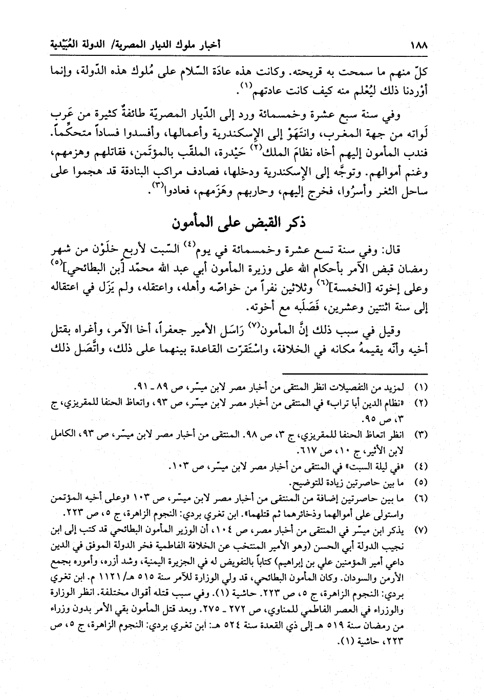 قال : وفي سنة تسع عشرة وخمسمائة في يوم السبت لأربع خلون من شهر رمضان قبض الآمر بأحكام الله على وزيره المأمون أبي عبد الله محمد وعلى إخوته الخمسة وثلاثين نفراً من خواصه وأهله ، واعتقله ، ولم يزل في اعتقاله إلى سنة اثنتين وعشرين ، فصلبه مع أخوته .