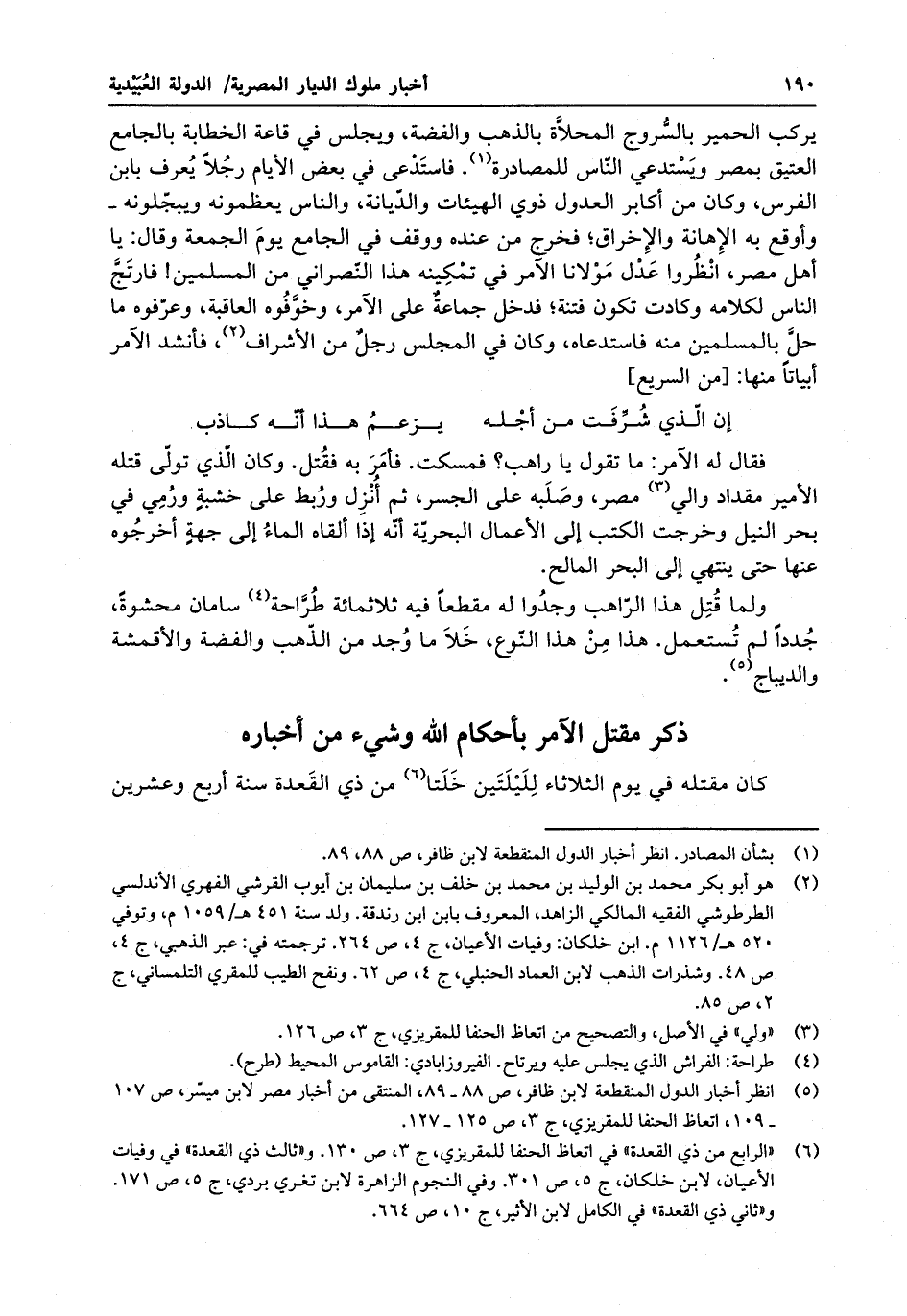 فقال له الآمر : ما تقول يا راهب ؟ فمسكت . فأمر به فقتل . وكان الذي تولى قتله الأمير مقداد والي مصر ، وصلبه على الجسر . ثم أنزل وربط على خشبة ورمي في بحر النيل وخرجت الكتب إلى الأعمال البحرية أنه إذا ألقاه الماء إلى جهة أخرجوه عنها حتى ينتهي إلى البحر المالح .