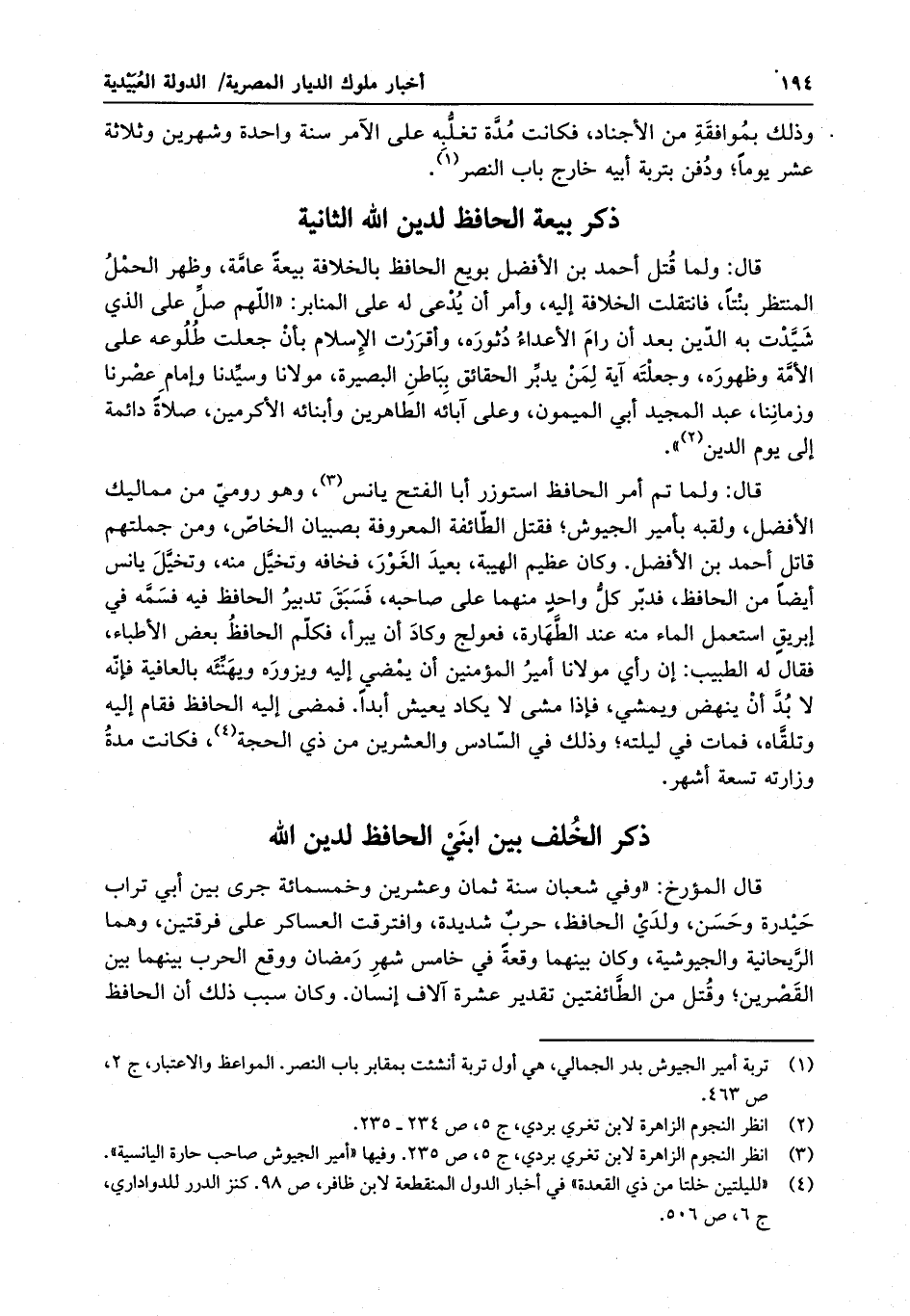 قال : ولما قتل أحمد بن الأفضل بويع الحافظ بالخلافة بيعة عامة ، وظهر الحمل المنتظر بنتاً ، فانتقلت الخلافة إليه ، وأمر أن يدعى له على المنابر ، اللهم صلّ على الذي شيدت به الدين بعد أن رام الأعداء دثوره ، وأقررت الإسلام بأن طلوعه على الأمة وظهروه ، وجعلته آية لمن يدبر الحقائق بباطن البصيرة ، مولانا وسيدنا وإمام عصرنا وزماننا ، عبد المجيد أبي الميمون ، وعلى آبائه الطاهرين وأبنائه الأكرمين ، صلاة دائمة إلى يوم الدين .