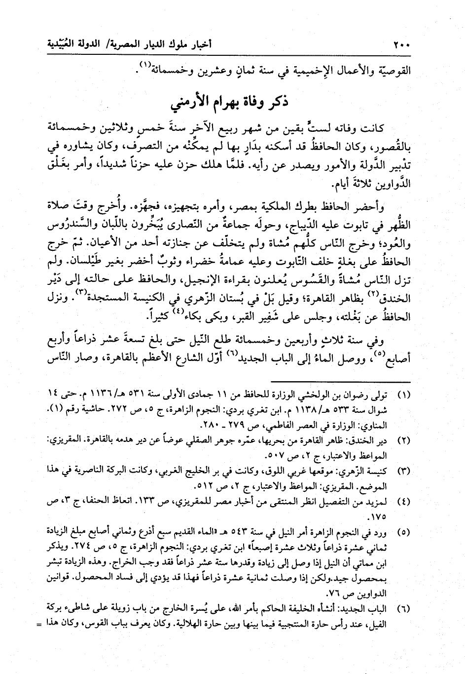 وأحضر الحافظ بطرك الملكية بمصر ، وأمره بتجهيزه ، فجهزه . وأخرج وقت صلاة الظهر في تابوت عليه الديباج ، وحوله جماعة من النصارى يبخرون باللبان والسندروس والعود ، وخرج الناس كلهم مشاة ولم يتخلف عن جنازته أحد من الأعيان . ثم خرج الحافظ على بغلة خلف التابوت وعليه عمامة خضراء وثوب أخضر بغير طيلسان . ولم تزل الناس مشاة والقسوس يعلنون بقراءة الإنجيل ، والحافظ على حالته إلى دير الخندق بظاهر القاهرة ، وقيل بل في بستان الزهري في الكنيسة المستجدة ونزل الحافظ عن بغلته ، وجلس على شفير القبر ، وبكى بكاء كثيراً .