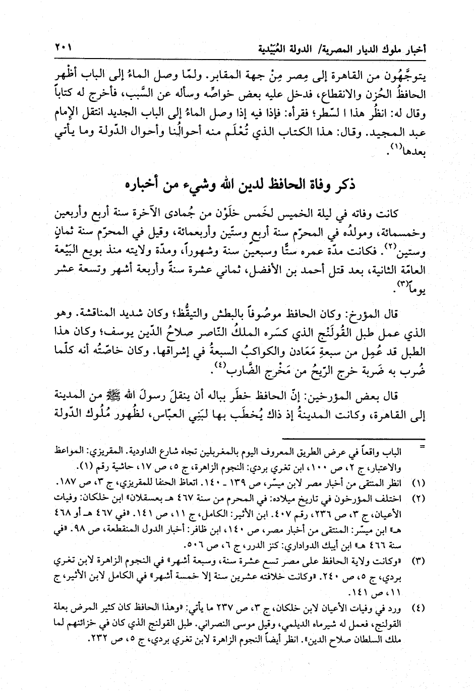 ذكر وفاة الحافظ لدين الله وشيء من أخباره كانت وفاته في ليلة الخميس لخمس خلون من جمادى الآخرة سنة أربع وأربعين وخمسمائة ، ومولده في المحرم سنة أربع وستين وأربعمائة ، وقيل في المحرم سنة ثمان وستين . فكانت مدة عمره ستاً وسبعين سنة وشهوراً ، ومدة ولايته منذ بويع البيعة العامة الثانية ، بع قتل أحمد بن الأفضل ، ثماني عشرة سنة وأربعة أشهر وتسعة عشر يوماً . قال المؤرخ : وكان الحافظ موصوفاً بالبطش والتيقظ ، وكان شديد المناقشة . وهو الذي عمل طبل القولنج الذي كسره الملك الناصر صلاح الدين يوسف ، وكان هذا الطبل قد عمل من سبعة معادن والكواكب السبعة في إشراقها . وكان خاصته أنه كلما ضرب به ضربة خرج الريح من مخرج الضارب .