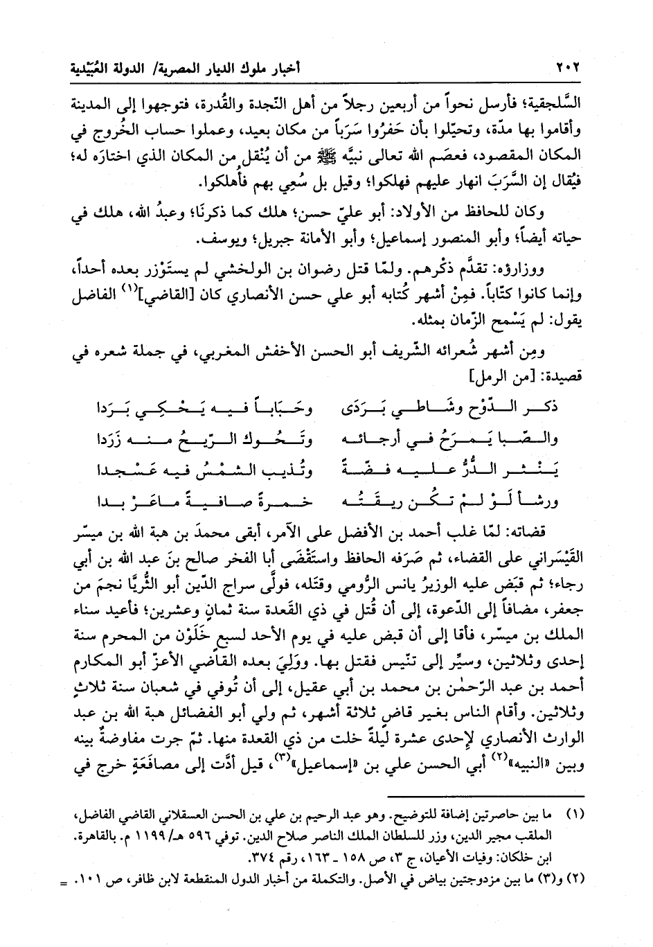 قضاته : لما غلب أحمد بن الأفضل على الآمر ، أبقي محمد ابن هبة الله ابن ميسر القيسراني على القضاء ، ثم صرفه الحافظ واستقضى أبا الفخر صالح بن عبد الله بن أبي رجاء ، ثم قبض عليه الوزير يانس الرومي وقتله ، فولي سراج الدين أبو الثريا نجم من جعفر ، مضافاً إلى الدعوة ، إلى أن قتل في ذي القعدة سنة ثمان وعشرين ، فأعيد سناء الملك بن ميسر ، فأقام إلى أن قبض عليه يوم الأحد لسبع خلون من المحرم سنة إحدى وثلاثين ، وسير تنيس فقتل بها . وولي بعده القاضي الأعز أبو المكارم أحمد بن عبد الرحمن بن محمد بن أبي عقيل ، إلى أن توفي في شعبان سنة ثلاث وثلاثين . وأقام الناس بغير قاض ثلاثة أشهر ، ثم ولي أبو الفضائل هبة الله بن عبد الوارث الأنصاري لإحدى عشرة ليلة خلت من ذي القعدة منها . ثم جرت مفاوضة بينه وبين النبيه أبي الحسن علي بن إسماعيل ، قيل أدت إلى مصافعة خرج في