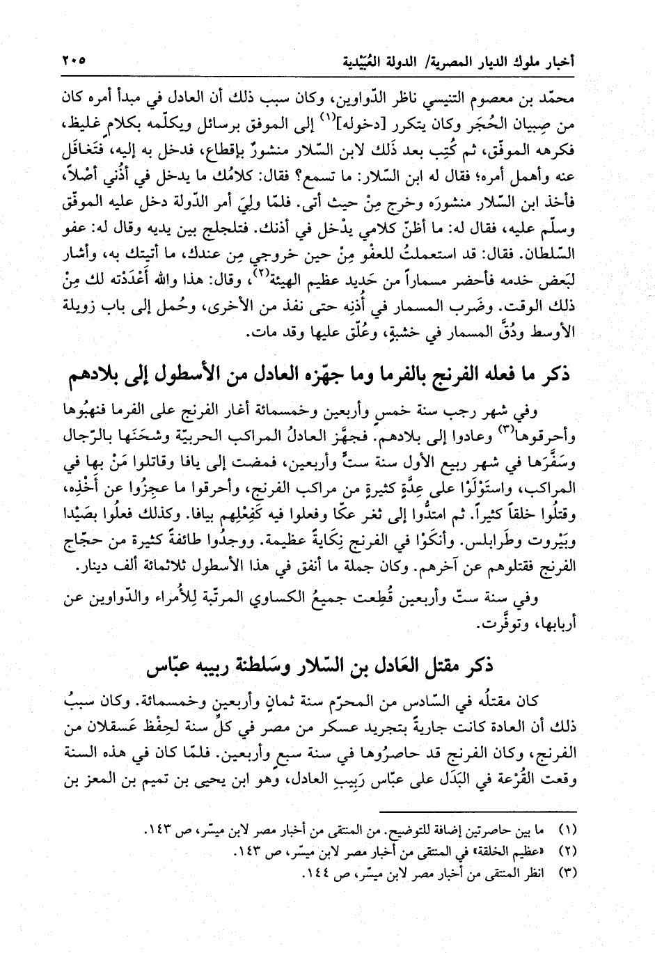 محمد بن معصوم التنيسي ناظر الدواوين ، وكان سبب ذلك أن العادل في مبدأ أمره كان من صبيان الحُجر وكان يتكرر دخوله إلى الموفق برسائل ويكلمه بكلام غليظ فكرهه الموفق ، ثم كتب بعد ذلك لابن السلار منشور بإقطاع ، فدخل به إليه ، فتغافل عنه وأهمل أمره : فقال له ابن السلار : ما تسمع ؟ فقال : كلامك ما يدخل في أذني أصلاً . فأخذ ابن السلار منشوره وخرج من حيث أتى . فلما ولي أمر الدولة دخل عليه الموفق وسلم عليه ، فقال له : ما أظن كلامي يدخل في أذنك . فتلجلج بين يديه وقال : عفو السلطان . فقال : قد استعملت للعفو من حين خروجي من عندك ، ما أتيتك به . وأشار لبعض خدمه فأحضر مسماراً من حديد عظيم الهيئة ، وقال : هذا والله أعددته لك من ذلك الوقت . وضرب المسمار من أذنه حتى نفذ من الأخرى ، وحمل إلى باب زويلة الأوسط ودق المسمار في خشبة ، وعلق عليها حتى مات .