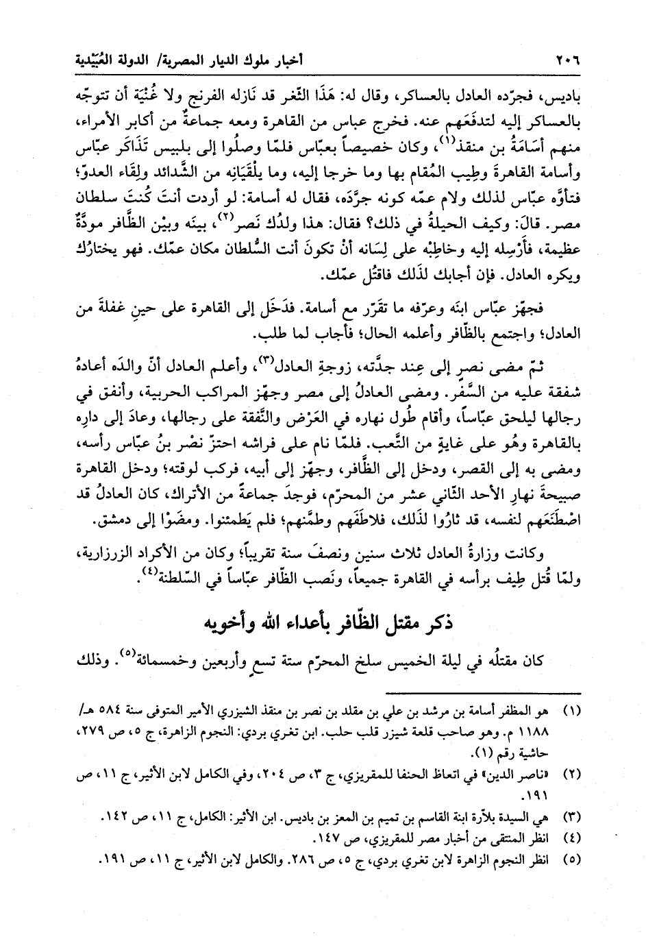 باديس ، فجرده العادل بالعساكر ، وقال له : هذا الثغر قد نازله الفرنج ، ولا غنية أن تتوجه بالعساكر إليه لتدفعهم عنه . فخرج عباس من القاهرة ومعه جماعة من أكابر الأمراء ، منهم أسامة بن منقذ ، وكان خصيصاً بعباس فلما وصلوا إلى بلبيس تذاكر عباس وأسامة القاهرة وطيب المقام بها وما خرجا إليه ، وما يلقيانه من الشدائد ولقاء العدو ، فتأوه عباس لذلك ولام عمه كونه جرده ، فقال له أسامة : لو أردت أنت كنت سلطان مصر . قال : وكيف الحيلة في ذلك ؟ فقال : هذا ولدك نصر ، بينه وبين الظافر مودة عظيمة ، فأرسله إليه وخاطبه على لسانه أن تكون أنت السلطان مكان عمك ، فهو يختارك ويكره العادل . فإن أجابك لذلك فاقتل عمك .