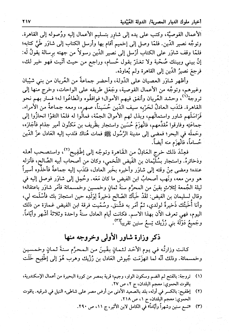 الأعمال القوصية ، وكتب على يده إلى شاور بتسليم الأعمال إليه ووصوله إلى القاهرة . وتوجه نصير الدين . فلما وصل إلى إخميم أقام بها وأرسل الكتاب إلى شاور طي كتابه ، فلما وقف شاور على الكتاب أرسل إلى نصير الدين رسولاً من جهته برسالة يقول له : إن بيني وبينك صحبة ولا تغتر بقول حسام ، وارجع من حيث أتيت فهو خير لك . رجع نصير الدين إلى القاهرة ولم يعاوده .