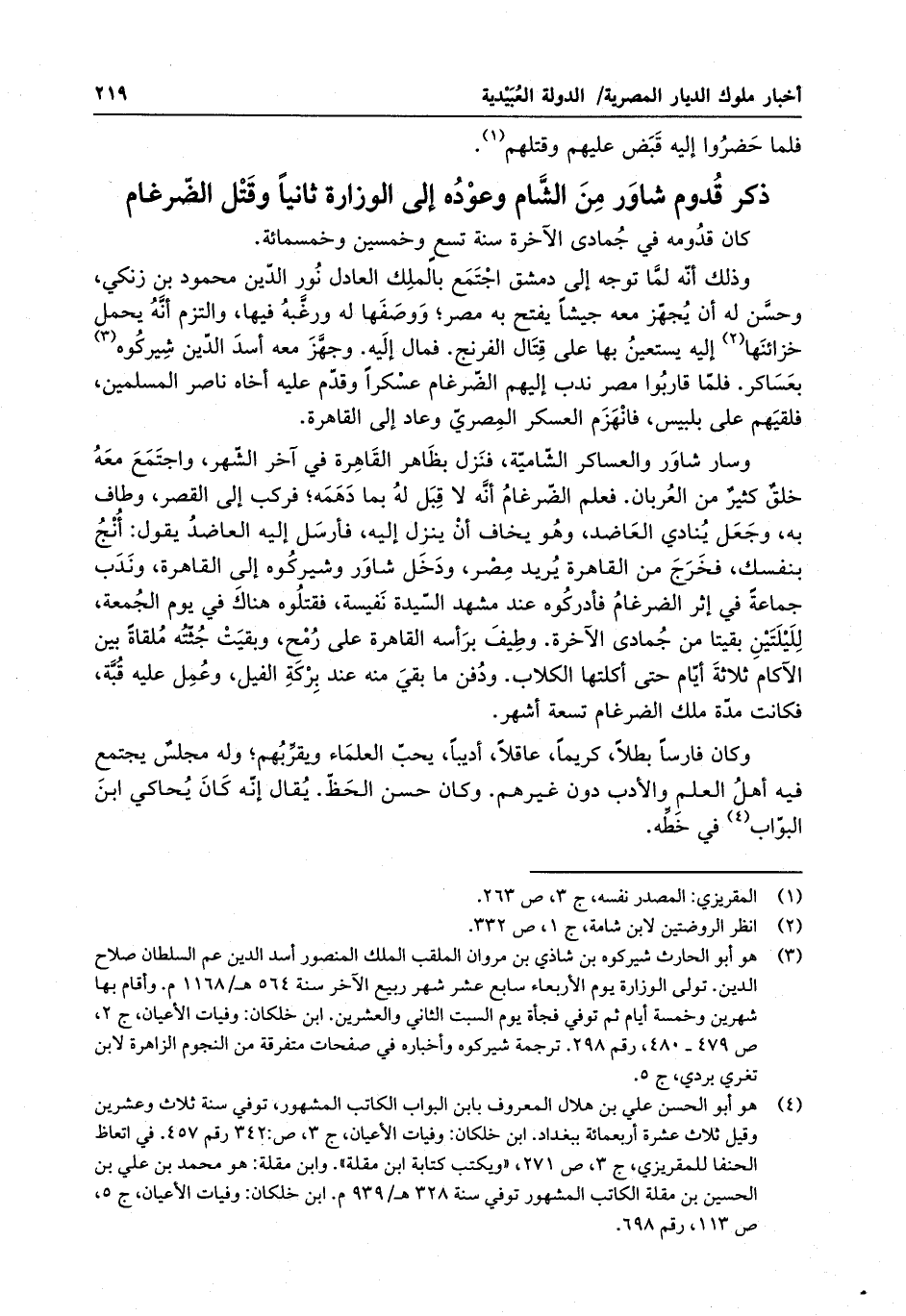 ذكر قدوم شاور من الشام وعوده إلى الوزارة ثانياً وقتل الضرغام