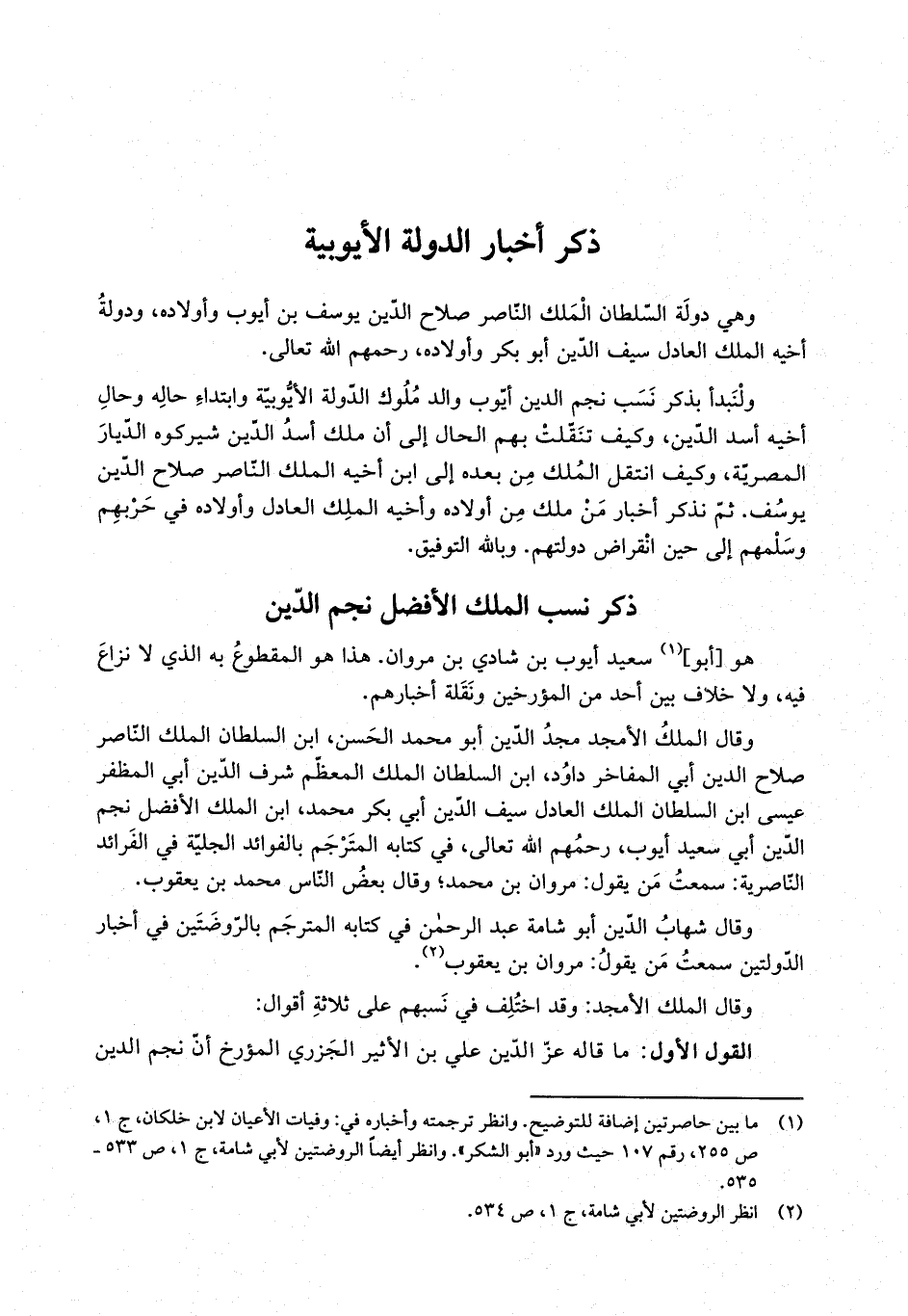 ولنبدأ بذكر نسب نجم الدين أيوب والد ملوك الدولة الأيوبية وابتداء حاله وحال أخيه أسد الدين ، وكيف تنقلت بهم الحال إلى أن ملك أسد الدين شيركوه الديار المصرية ، وكيف انتقل الملك من بعده إلى ابن أخيه الملك الناصر صلاح الدين يوسف . ثم نذكر أخبار من ملك من أولاده وأخيه الملك العادل وأولاده في حربهم وسلمهم إلى حين انقراض دولتهم . وبالله التوفيق