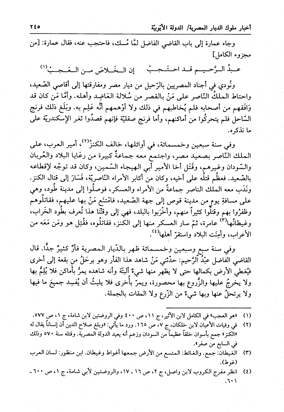 ونودي في أجناد المصريين بالرحيل من ديار مصر ومفارقتها إلى أقاصي الصعيد ، واحتاط الملك الناصر على من بالقصر من سلالة العاضد وأهله . وأما من كان قد وافقهم من أصحابه فلم يخاطبهم في ذلك ولا أوهمهم أنه علم به . وبلغ ذلك فرنج الساحل فلم يتحركوا من أماكنهم ، وأما فرنج صقلية فإنهم قصدوا ثغر الإسكندرية على ما نذكره . وفي سنة سبعين وخمسمائة ، في أوائلها ، خالف الكنز ، أمير العرب ، على الملك الناصر بصعيد مصر ، واجتمع معه جماعة كبيرة من رعايا البلاد والعربان والسودان وغيرهم ، وقتل أخا الأمير أبي الهيجاء السمين ، وكان قد توجه لإقطاعه بالصعيد . فعظم قتله على أخيه ، وكان من أكابر الأمراء الناصرية ، فسار إلى قتال الكنز . وندب معه الملك الناصر جماعة من الأمراء والعسكر ، فوصلوا إلى مدينة طود ، وهي على مسافة يوم من مدينة قوص إلى جهة الصعيد ، فامتنع من بها عليهم ، فقاتلوهم وظفوا بهم وقتلوا كثيراً منهم ، وخربوا البلد ، فهي إلى وقتنا هذا تعرف بطود الخراب ، وغيطانها عامرة . ثم سار العسكر منها إلى الكنز ، فقاتلوه ، فقتل هو ومن معه من الأعراب ، وأمنت البلاد واستقر أهلها .
