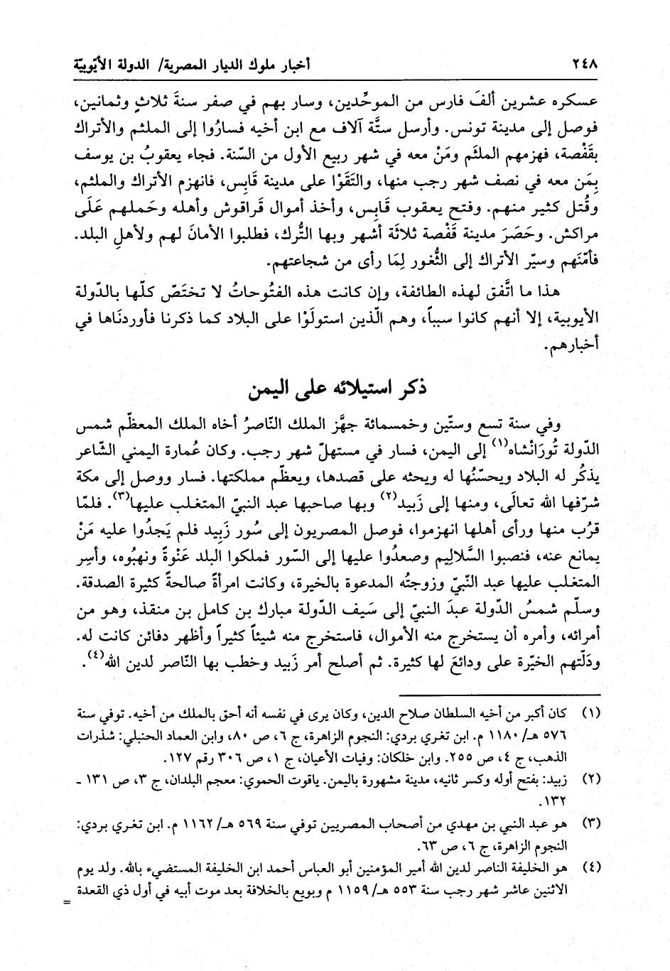 وفي سنة تسع وستين وخمسمائة جهز الملك الناصر أخاه الملك المعظم شمس الدولة تورانشاه إلى اليمن ، فسار في مستهل شهر رجب . وكان عمارة اليمني الشاعر يذكر له البلاد ويحسنها له ويحثه على قصدها ، ويعظم مملكتها . فسار ووصل إلى مكة شرفها الله تعالى ، ومنها إلى زبيد وبها صاحبها عبد النبي المتغلب عليها . فلما قرب منها ورأى أهلها انهزموا ، فوصل المصريون إلى سور زبيد فلم يجدوا عليه من يمانع عنه ، فنصبوا السلالم وصعدوا عليها إلى السور فملكوا البلد عنوة ونهبوه ، وأسر المتغلب عليها عبد النبي وزوجته المدعوة بالخيرة ، وكانت امرأة صالحة كثيرة الصدقة . وسلم شمس الدولة عبد النبي إلى يوسف سيف الدولة مبارك بن كامل بن منقذ ، وهو من أمرائه ، وأمره أن يستخرج منه الأموال ، فاستخرج منه شيئاً كثيراً وأظهر دفائن كانت له . ودلتهم الخيرة على ودائع لها كثيرة . ثم أصلح أمر زبيد وخطب بها للناصر لدين الله .