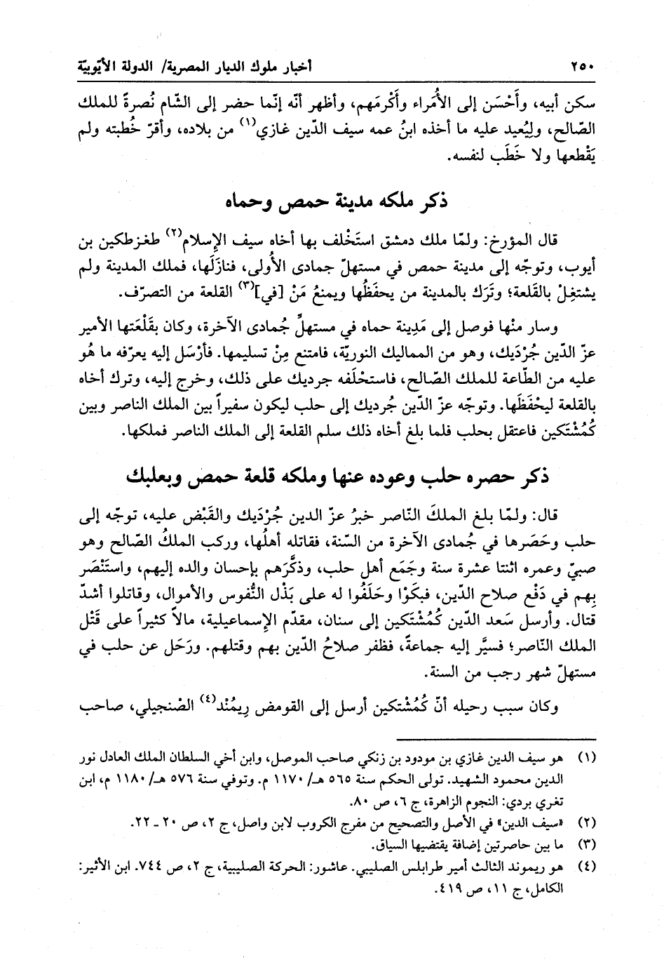 قال المؤرخ : ولما ملك دمشق استخلف بها أخاه سيف الإسلام طغزتيكين بن أيوب ، وتوجه إلى مدينة حمص في مستهل جمادى الأولى ، فنازلها ، فملك المدينة ولم يشتغل بالقلعة ، وترك بالمدينة من يحفظها ويمنع من في القلعة من التصرف . وسار منها فوصل إلى مدينة حماة في مستهل جمادى الآخرة ، وكان بقلعتها الأمير عز الدين جرديك ، وهو من المماليك النورية ، فامتنع من تسليمها . فأرسل إليه يعرفه ما هو عليه من الطاعة للملك الصالح ، فاستحلفه جرديك على ذلك ، وخرج إليه ، وترك أخاه بالقلعة ليحفظها . وتوجه عز الدين جرديك إلى حلب ليكون سفيراً بين الملك الناصر وبين كمشتكين فاعتقل بحلب فلما بلغ أخاه ذلك سلم القلعة إلى الملك الناصر .