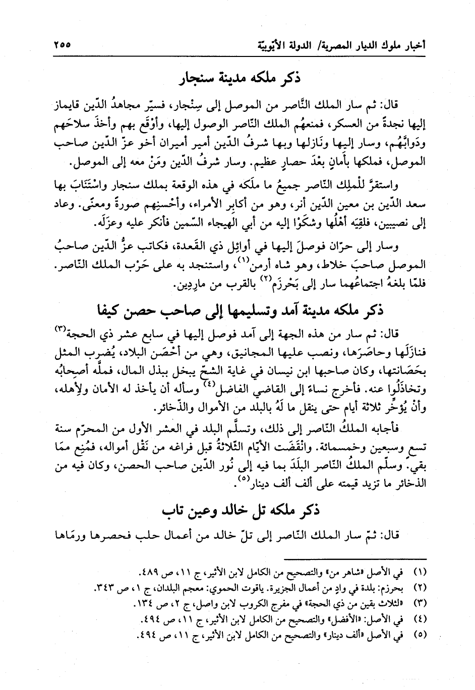 قال : ثم سار الملك الناصر من الموصل إلى سنجار ، فسير مجاهد الدين قايماز إليها نجدة من عسكره ، فمنعهم الملك الناصر الوصول إليها وأوقع بهم وأخذ سلاحهم ودوابهم وسار إليها ونازلها وبها شرف الدين صاحب الموصل ، فملكها بأمان بعد حصار عظيم وسار شرف الدين ومن معه إلى الموصل . واستقر للملك الناصر جميع ما ملكه في هذه الوقعة بملك سنجار واستناب بها سعد الدين بن معين الدين أنر ، وهو من أكابر الأمراء ، وأحسنهم صورة ومعنى . وعاد إلى نصيبين ، فلقيه أهلها وشكوا إليه من أبي الهيجاء السمين فأنكر عليه وعزله .