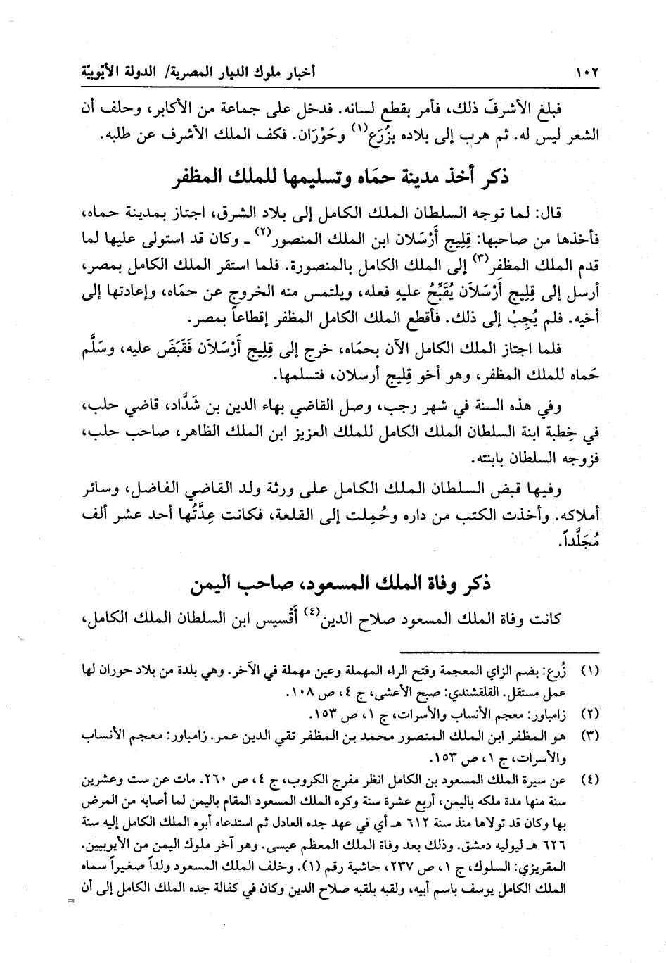 قال : لما توجه السلطان الملك الكامل إلى بلاد الشرق ، اجتاز بمدينة حماه ، فأخذها من صاحبها : قليج أرسلان بن الملك المنصور - وكان قد استولى عليها لما قدم الملك المظفر إلى الملك الكامل بالمنصورة . فلما استقر الملك الكامل بمصر ، أرسل إلى قليج أرسلان يقبح عليه فعله ، ويلتمس منه الخروج عن حماه ، وإعادتها إلى أخيه . فلم يجب إلى ذلك . فأقطع الملك الكامل المظفر إقطاعاً بمصر .