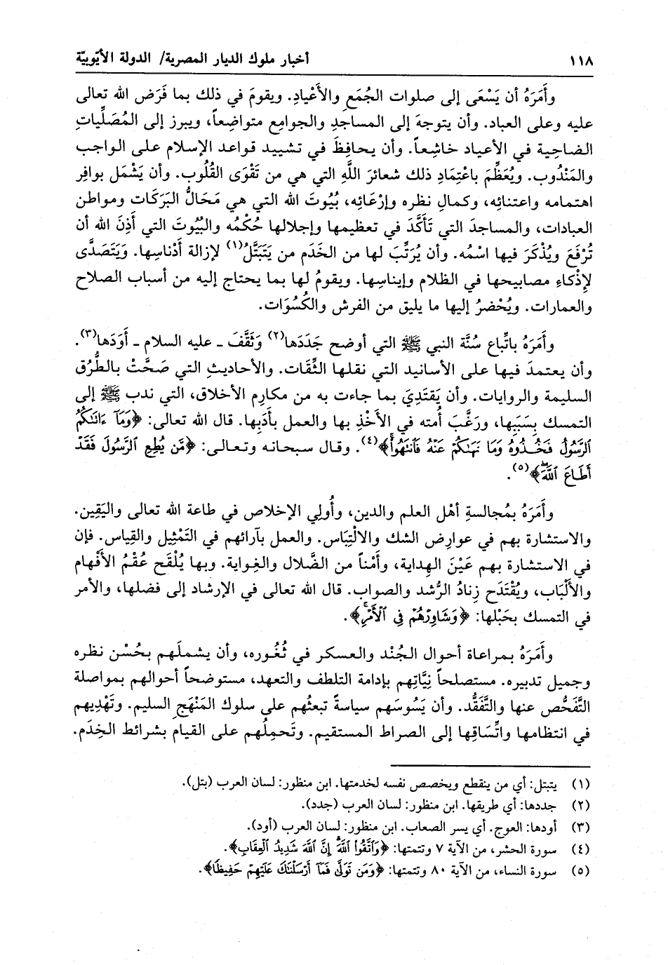 وأمره أن يسعى إلى صلوات الجمع والأعياد . ويقوم في ذلك بما فرض الله تعالى عليه وعلى العباد . وأن يتوجه إلى المساجد والجوامع متواضعاً ، ويبرز إلى المصليات الضاحية في الأعياد خاشعاً . وأن يحافظ في تشييد قواعد الإسلام على الواجب والمندوب . ويعظم باعتماد ذلك شعائر الله التي هي من تقوى القلوب . وأن يشمل بوافر اهتمامه واعتنائه ، وكمال نظره وإرعائه ، بيوت الله التي هي محال البركات ومواطن العبادات ، والمساجد التي تأكد في تعظيمها وإجلالها حكمه والبيوت التي أذن الله أن ترفع ويذكر فيها اسمه . وأن يرتب لها من الخدم من يتبتل لإزالة أدناسها . ويتصدى لإذكاء مصابيحها في الظلام وإيناسها . ويقوم لها بما تحتاج إليه من أسباب الصلاح والعمارات . ويحضر إليها ما يليق من الفرش والكسوات . وأمره باتباع سنة النبي - ( صلى الله عليه وسلم ) - التي أوضح جددها وثقف - عليه السلام - أودها . وأن يعتمد فيها على الأسانيد التي نقلها الثقات . والأحاديث التي صحت بالطرق السليمة والروايات . وأن يقتدى بما جاءت به من مكارم الأخلاق ، التي ندب - ( صلى الله عليه وسلم ) - إلى التمسك بسببها ، ورغب أمته في الأخذ بها والعمل بأدبها . قال الله تعالى : " وما آتاكم الرسولُ فخُذوه وما نهاكم عنه فانْتَهُوا " . وقال سبحانه وتعالى : " من يُطِعِ الرسولَ فقد أطاع الله " .
