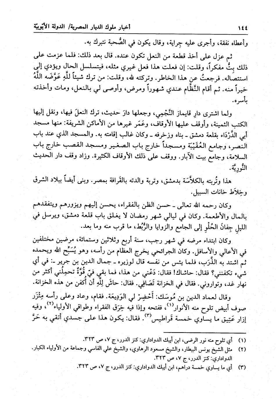 ولما اشترى دار قايماز النجمي ، وجعلها دار حديث ، ترك النعل فيها ، ونقل إليها الكتب الثمينة ، وأوقف عليها الأوقاف . وعمر غيرها من الأماكن الشريفة : منها مسجد أبي الدرداء بقلعة دمشق - بناه وزخرفه - وكان غالب إقامته به . والمسجد الذي عند باب النصر ، وجامع العقيبة ومسجداً خارج باب الصغير ومسجد القصب خارج باب السلامة ، وجامع بيت الآبار . ووقف على ذلك الأوقاف الكثيرة . وزاد وقف دار الحديث النورية .