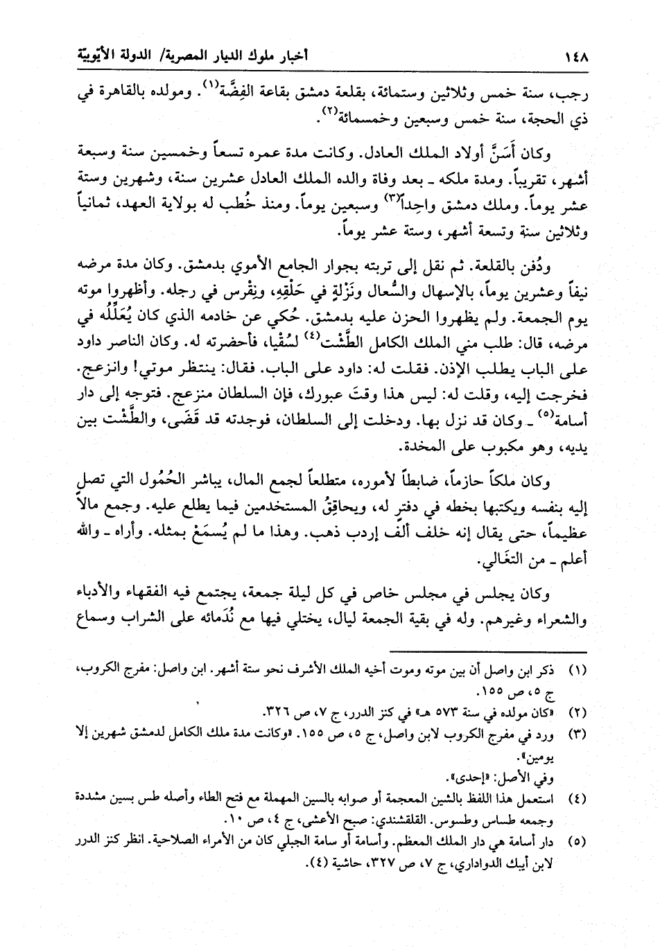 وكان أسن أولاد الملك العادل . وكانت مدة عمره تسعا وخمسين سنة وسبعة أشهر - تقريباً . ومدة ملكه - بعد وفاة والده الملك العادل عشرين سنة ، وشهرين وستة عشر يوماً . وملك دمشق واحداً وسبعين يوماً . ومنذ خطب له بولاية العهد ، ثمانياً وثلاثين سنة وتسعة أشهر ، وستة عشر يوماً .