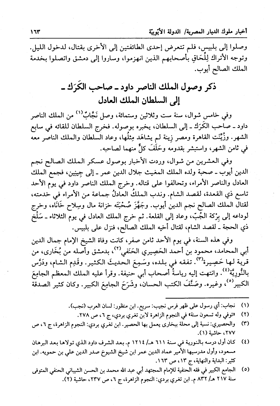 وفي العشرين من شوال ، وردت الأخبار بوصول عسكر الملك الصالح نجم الدين أيوب - صحبة ولده الملك المغيث جلال الدين عمر - إلى جينين فجمع الملك العادل والناصر الأمراء ، وتحالفوا على قتاله . وخرج الملك الناصر داود في يوم الأحد تاسع ذي القعدة ، لقصد الشام . وندب الملك العادل جماعة من الأمراء في خدمته ، لقتال الملك الصالح نجم الدين أيوب . وجهز صحبته خزانة مال وسلاح خاناه ، وخرج لوداعه إلى بركة الجب ، وعاد إلى القلعة . ثم خرج الملك العادل في يوم الثلاثاء - سلخ ذي الحجة - لقصد الشام ، لقتال أخيه الملك الصالح ، فنزل على بلبيس وفي هذه السنة ، في يوم الأحد ثامن صفر ، كانت وفاة الشيخ الإمام جمال الدين أبي المحامد ، محمود بن أحمد الحصيري الحنفي ، بدمشق . وأصله من بخارى ، من قرية يقال لها حصيره . تفقه في بلده ، وسمع الحديث الكثير . وقدم الشام ، ودرس بالنورية . وانتهت إليه رياسة أصحاب أبي حنيفة . وقرأ عليه الملك المعظم الجامع الكبير ، وغيره . وصنف الكتب الحسان ، وشرح الجامع الكبير . وكان كثير الصدقة