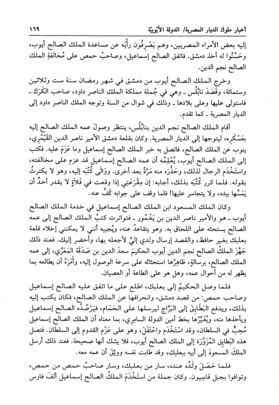 إليه بعض ا " لأمراء المصريين ، وهم يصرفون رأيه عن مساعدة الملك الصالح أيوب ، وحسنوا له أخذ دمشق . فاتفق الصالح إسماعيل ، وصاحب حمص على مخالفة الملك الصالح نجم الدين .
