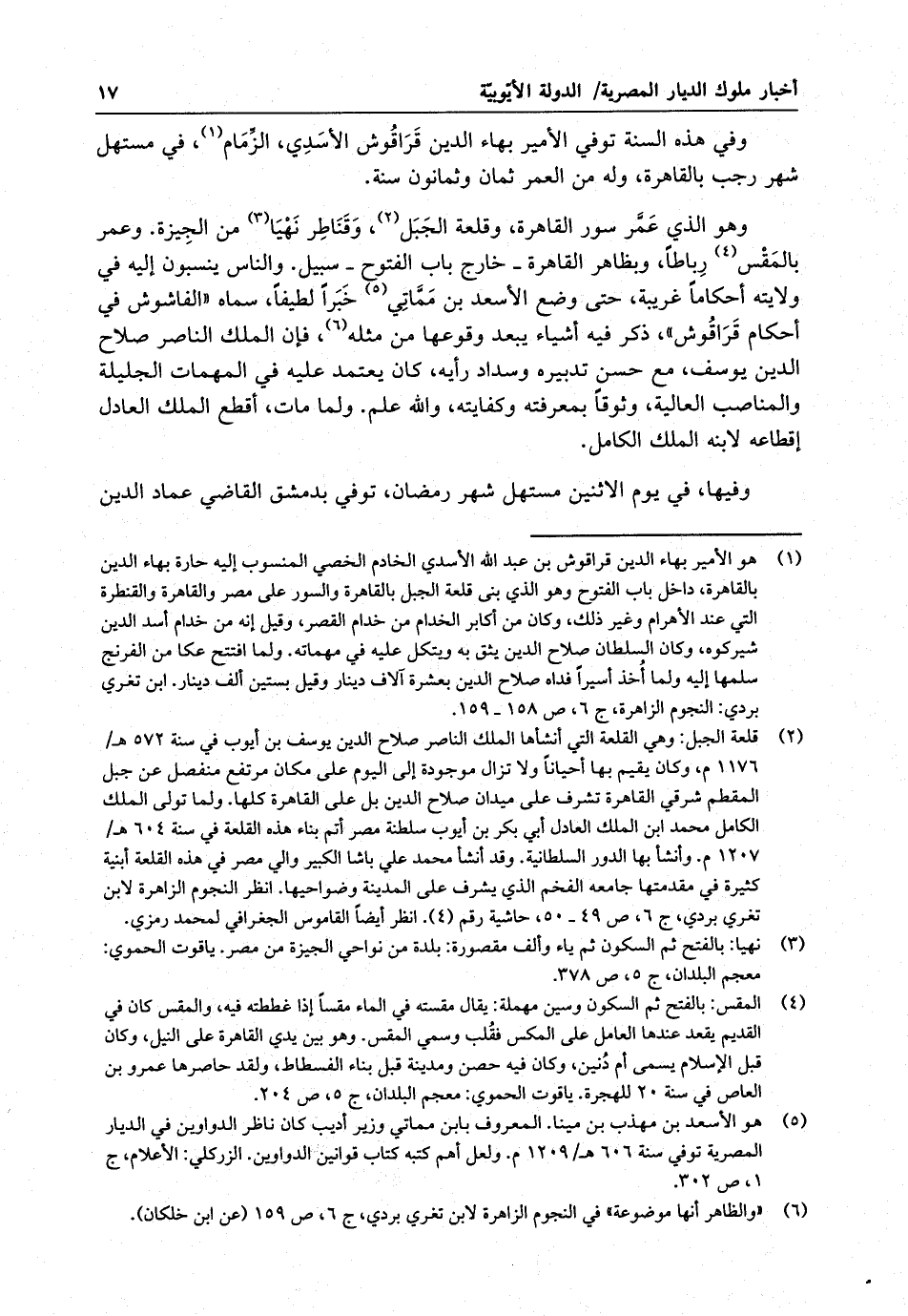 وهو الذي عمر سور القاهرة ، وقلعة الجبل وقناطر نهيا من الجيزة . وعمر بالمقس رباطاً ، وبظاهر القاهرة - خارج باب الفتوح - سبيل . والناس ينسبون إليه في ولايته أحكاماً غريبة ، حتى وضع الأسعد بن مماتى خبراً لطيفاً ، سماه الفاشوش في أحكام قراقوش ، ذكر فيه أشياء يبعد وقوعها من مثله ، فإن الملك الناصر صلاح الدين يوسف ، مع حسن تدبيره وسداد رأيه ، كان يعتمد عليه في المهمات الجليلة والمناصب العالية ، وثوقاً بمعرفته وكفايته . والله أعلم . ولما مات ، أقطع الملك العادل إقطاعه لابنه الملك الكامل .