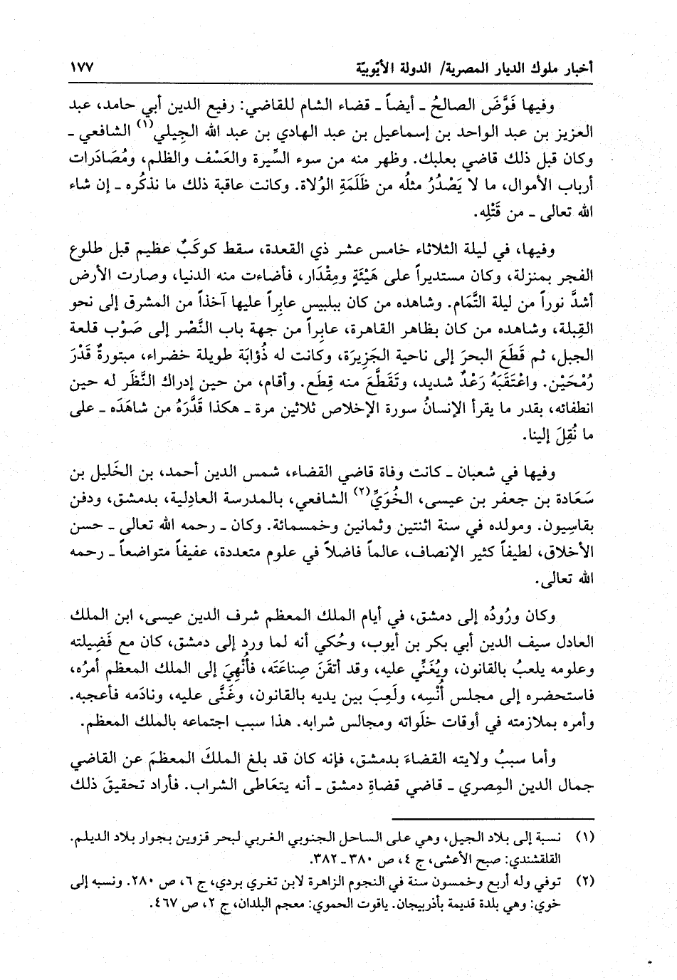 وفيها ، في ليلة الثلاثاء خامس عشر ذي القعدة ، سقط كوكبٌ عظيم قبل طلوع الفجر بمنزلة ، وكان مستديراً على هيئةٍ ومقدار ، فأضاءت منه الدنيا ، وصارت الأرض أشد نوراً من ليلة التمام . وشاهده من كان ببلبيس عابراً عليها آخذاً من المشرق إلى نحو القبلة ، وشاهده من كان بظاهر القاهرة ، عابراً من جهة باب النصر إلى صوب قلعة الجبل . ثم قطع البحر إلى ناحية الجزيرة ، وكانت له ذؤابة طويلة خضراء ، مبتورةٌ قدر رمحين . واعتقبه رعدٌ شديد ، وتقطع منه قطع . وأقام ، من حين إدراك النظر له حين انطفائه ، بقدر ما يقرأ الانسان سورة الإخلاص ثلاثين مرة - هكذا قدره من شاهده - على ما نقل إلينا . وفيها في شعبان - كانت وفاة قاضي القضاء ، شمس الدين أحمد ، ابن الخليل بن سعادة بن جعفر بن عيسى ، الخويي الشافعي ، بالمدرسة العادلية ، بدمشق ، ودفن بقاسيون . ومولده في سنة اثنتين وثمانين وخمسمائة . وكان - رحمه الله تعالى - حسن الأخلاق ، لطيفاً كثير الإنصاف ، عالماً فاضلاً في علوم متعددة ، عفيفاً متواضعاً - رحمه الله تعالى .