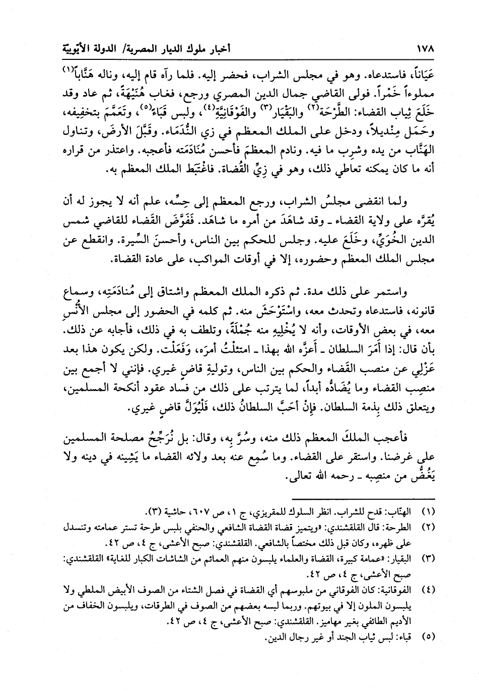 عياناً ، فاستدعاه ، وهو في مجلس الشراب ، فحضر إليه . فلما رآه قام إليه ، وناوله هناباً مملوءاً خمراً . فولى القاضي جمال الدين المصري ورجع ، فغاب هنيهة ، ثم عاد وقد خلع ثياب القضاء : الطرحة والبقيار والفوقانية ، ولبس قباءً ، وتعمم بتخفيفه وحمل منديلا . ودخل على الملك المعظم في زي الندماء . وقبل الأرض ، وتناول الهناب من يده وشرب ما فيه . ونادم المعظم فأحسن منادمته فأعجبه . واعتذر من قراره أنه ما كان يمكنه تعاطي ذلك ، وهو في زي القضاة . فاغتبط الملك المعظم به .