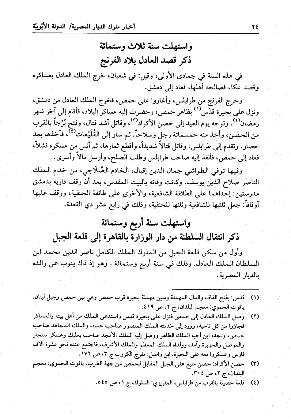 واستهلت سنة أربع وستمائة ذكر انتقال السلطنة من دار الوزارة بالقاهرة إلى قلعة الجبل