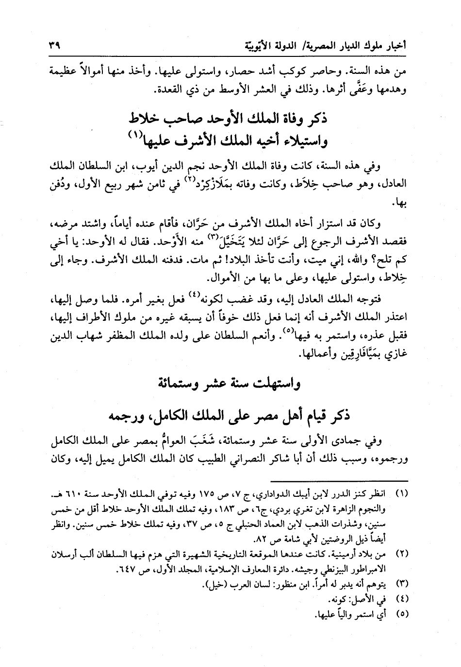 وفي هذه السنة ، كانت وفاة الملك الأوحد نجم الدين أيوب ، بن السلطان الملك العادل ، وهو صاحب خلاط . وكانت وفاته بملازكرد في ثامن شهر ربيع الأول ، ودفن بها .