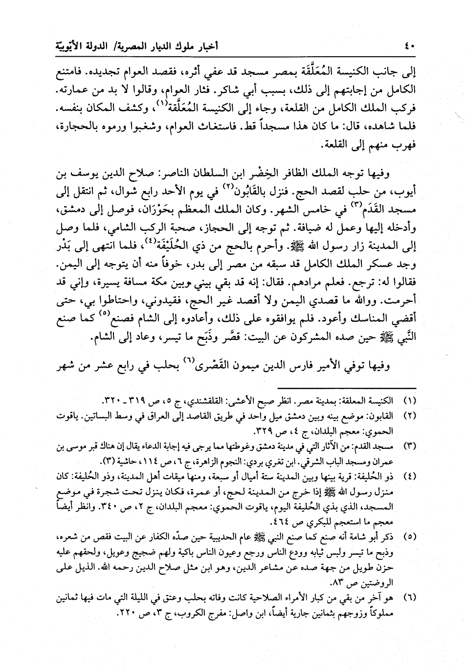 وفيها توجه الملك الظافر الخضر ، بن السلطان الناصر : صلاح الدين يوسف بن أيوب ، من حلب لقصد الحج . فنزل بالقابون في يوم الأحد رابع شوال ، ثم انتقل إلى مسجد القدم في خامس الشهر . وكان الملك المعظم بحوران ، فوصل إلى دمشق ، وأدخله إليها وعمل له ضيافة . ثم توجه إلى الحجاز ، صحبة الركب الشامي ، فلما وصل إلى المدينة زار رسول الله ( صلى الله عليه وسلم ) . وأحرم بالحج من ذي الحليفة ، فلما انتهى إلى بدر وجد عسكر الملك الكامل قد سبقه من مصر إلى بدر ، خوفاً منه أن يتوجه إلى اليمن . فقالوا له : ترجع . فعلم مرادهم . فقال إنه قد بقي بيني وبين مكة مسافة يسيرة ، وإني قد أحرمت . ووالله ما قصدي اليمن ولا أقصد غير الحج ، فقيدوني ، واحتاطوا بي ، حتى أقضي المناسك وأعود . فلم يوافقوه على ذلك ، وأعادوه إلى الشام فصنع كما صنع النبي ( صلى الله عليه وسلم ) حين صده المشركون عن البيت : قصر وذبح ما تيسر ، وعاد إلى الشام .