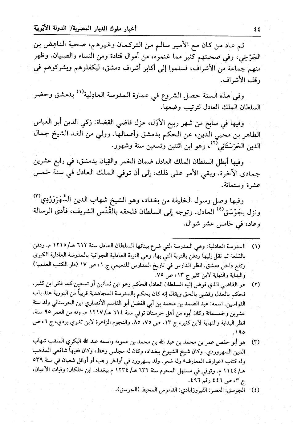 وفيها وصل رسول الخليفة من بغداد ، وهو الشيخ شهاب الدين السهروردي ونزل بجوسق العادل . وتوجه إلى السلطان فلحقه بالقدس الشريف ، فأدى الرسالة وعاد ، في خامس عشر شوال .