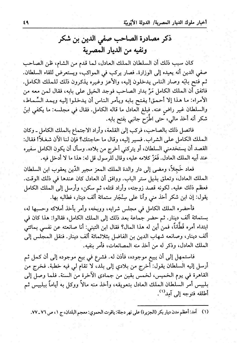فاستمهل إلى أن يبيع موجوده ، فأذن له . فشرع في بيع موجوده إلى أن كمل ثم أرسل إليه السلطان يقول : أخرج من بلادي إلى بلد ، لا تقام لي فيه خطبة . فخرج من القاهرة في يوم الخميس ، لخمس بقين من جمادى الآخرة من السنة . فلما وصل إلى بلبيس أمر السلطان الملك العادل بتعويقه ، وأخذ منه مالاً ووكل به أياماً ببلبيس ثم أطلقه فتوجه إلى آمد .