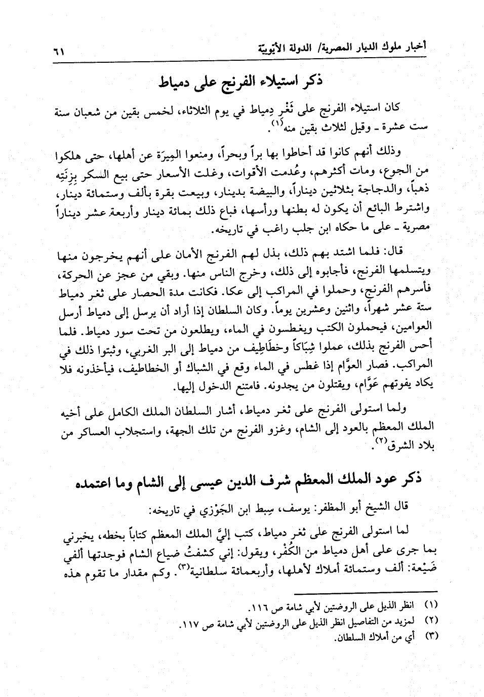 كان استيلاء الفرنج على ثغر دمياط في يوم الثلاثاء ، لخمس بقين من شعبان سنة ست عشرة - وقيل لثلاث بقين منه .