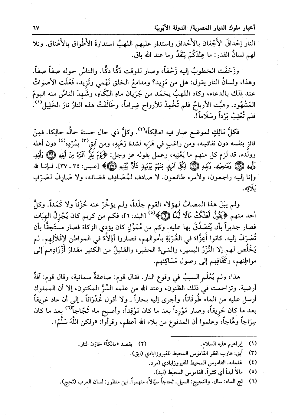 وزحفت الخطوب إليه زحفا ، وصار للوقت دكاً دكا . والناس حوله صفاً صفا . ولسان النار يقول : هل من مزيد ؟ ومدامع الخلق تهمى وتزيد ، فعلت الأصوات عند ذلك بالدعاء ، وكاد اللهب يخمد من جريان ماء البكاء ، وشهد الناس منه اليوم المشهود . وهبت الأرياح فلم تخمد للأرواح ضراما ، وخالفت هذه النار نار الخليل ، فلم تعقب برداً وسلاما فكل مالكٍ لموضع صار فيه مالكا . وكل ذي حال حسنة حاله حالكا . فمن فائزٍ بنفسه دون نفائسه ، ومن راغبٍ في هربه لشدة رهبه ، ومن آبقٍ بمرده دون أهله وولده . قد لزم كل منهم ما يعنيه ، وعمل بقوله عز وجل : يوم يفر المرء من أخيه وأمه وأبيه وصاحبته وبنيه ، لكل امريءٍ منهم يومئذ شأن يغنيه . فإنا لله وانا إليه راجعون ، ولأمره طائعون . لا صادق لمصادف قضائه ، ولا صارف لصرف بلائه . لم يبق هذا المصاب لهؤلاء القوم جلدا ، ولم يؤخر عنه حزنا ولا كمدا . وكل أحد منهم يقول : أهلكت مالاً لبدا . فكم من كريم كان يجزل الهبات فصار جديرا بأن يتصدق بها عليه . وكم من ممولٍ كان يؤدى الزكاة فصار مستحقاً بأن تصرف إليه . كانوا أعزاء في الغربة بأموالهم ، فصاروا أذلاء في المواطن لإقلالهم . لم يخلص لهم إلا النزر اليسير ، والشيء الحقير ، والقليل من الكثير مقدار أزوادهم إلى مواطنهم ، وكفافهم إلى وصول مساكنهم .