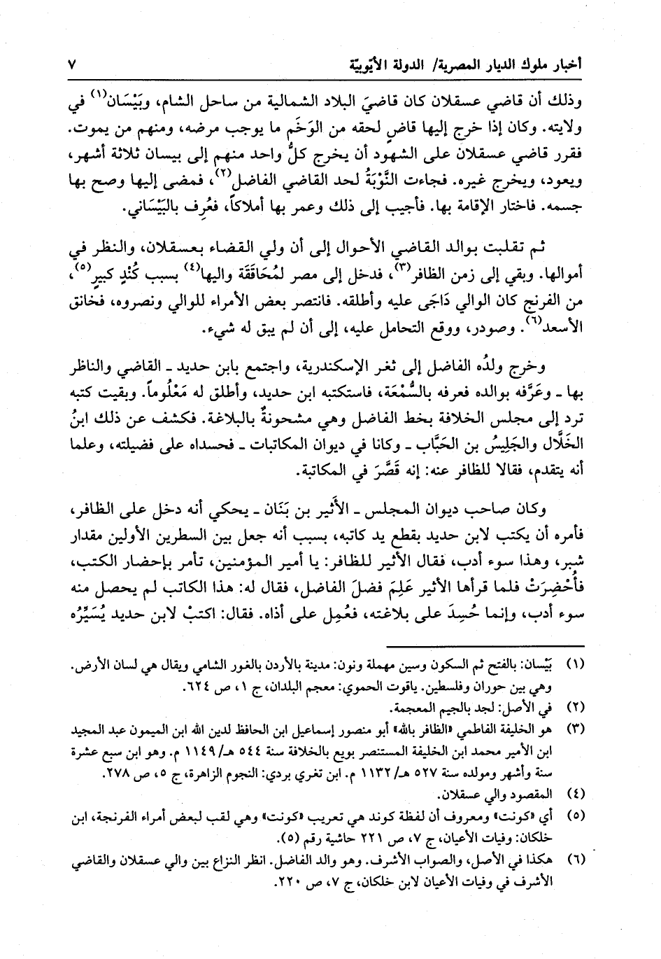 وخرج ولده الفاضل إلى ثغر الإسكندرية ، واجتمع بابن حديد - القاضي والناظر بها - وعرفه بوالده فعرفه بالسمعة ، فاستكتبه ابن حديد ، وأطلق له معلوماً . وبقيت كتبه ترد إلى مجلس الخلافة بخط الفاضل وهي مشحونةٌ بالبلاغة . فكشف عن ذلك ابن الخلال والجليس بن الحباب - وكانا في ديوان المكاتبات - فحسداه على فضيلته ، وعلما أنه يتقدم ، فقالا للظافر عنه : انه قصر في المكاتبة .