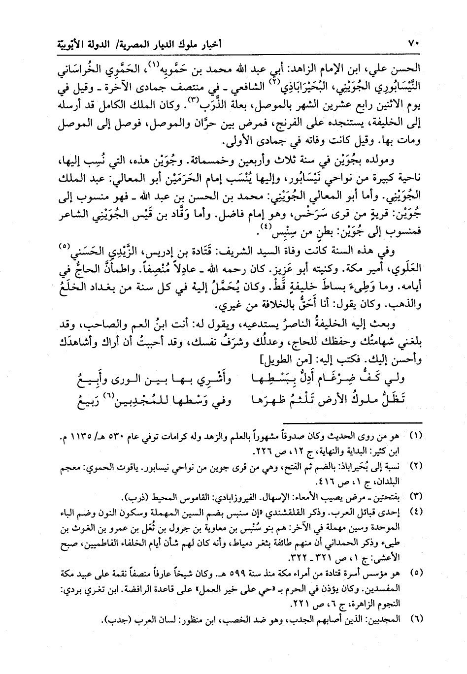 الحسن علي ، بن الإمام الزاهد : أبي عبد الله محمد ، بن حمويه ، الحموي الخراساني النيسابوري الجويني ، البحيراباذي الشافعي - في منتصف جمادى الآخرة - وقيل في يوم الاثنين رابع عشرين الشهر بالموصل ، بعلة الذرب . وكان الملك الكامل قد أرسله إلى الخليفة ، يستنجده على الفرنج ، فمرض بين حران والموصل ، فوصل إلى الموصل ومات بها . وقيل كانت وفاته في جمادى الأولى . ومولده بجوين في سنة ثلاث وأربعين وخمسمائة . وجوين هذه ، التي نسب إليها ، ناحية كبيرة من نواحي نيسابور ، وإليها ينسب إمام الحرمين أبو المعالي : عبد الملك الجويني . وأما أبو المعالي الجويني : محمد بن الحسن ابن عبد الله - فهو منسوب إلى جوين : قريةٍ من قرى سرخس . وهو إمام فاضل . وأما وقاد بن قيس الجويني الشاعر فمنسوب إلى جوين : بطنٍ من سنبس .