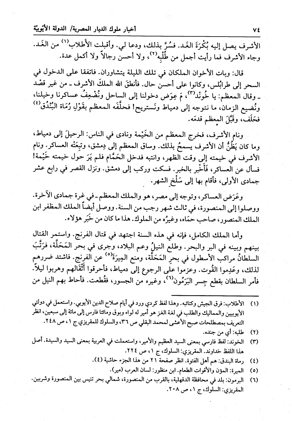 وعرض العساكر ، وتوجه إلى مصر ، هو والملك المعظم - في غرة جمادى الآخرة . ووصلوا إلى المنصورة ، في ثالث شهر رجب من السنة . ووصل أيضاً الملك المظفر بن الملك المنصور ، صاحب حماه ، وغيره من الملوك . هذا ما كان من خبر هؤلاء . وأما الملك الكامل ، فإنه في هذه السنة اجتهد في قتال الفرنج . . واستمر القتال بينهم وبينه في البر والبحر . وطلع النيل وعم البلاد ، وجرى في بحر المحلة ، فرتب السلطان مراكب الأسطول في بحر المحلة ، ومنع الميرة عن الفرنج . فاشتد ضررهم لذلك ، وعدموا القوت . وعزموا على الرجوع إلى دمياط ، فأحرقوا أثقالهم وهربوا ليلاً . فأمر السلطان بقطع جسر البرمون ، وغيره من الجسور ، فقطعت . فأحاط بهم النيل من