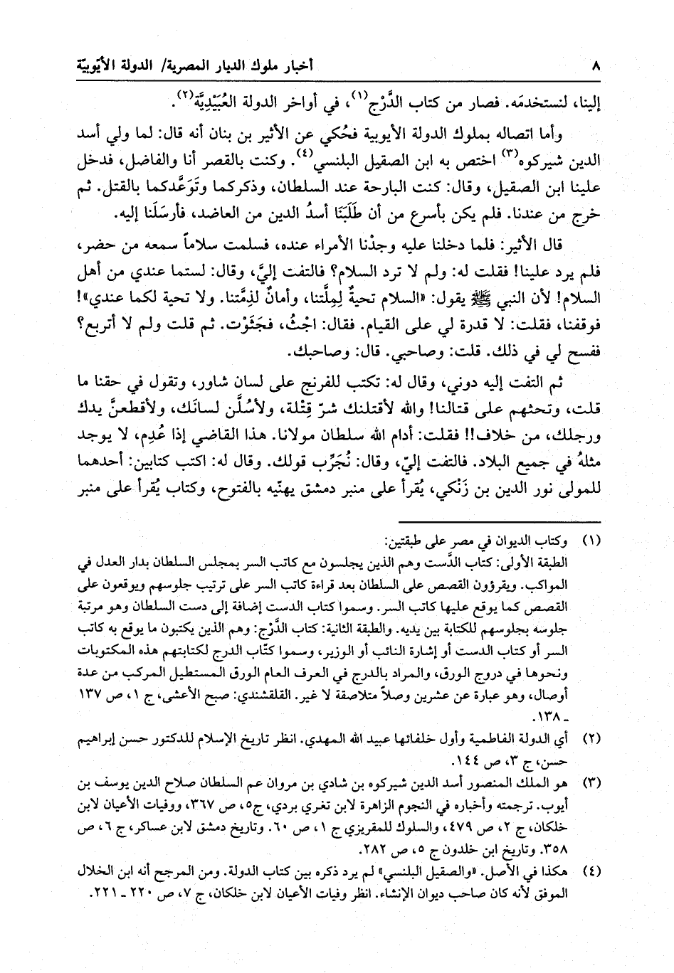 ثم التفت إليه دوني ، وقال له : تكتب للفرنج على لسان شاور ، وتقول في حقنا ما قلت ، وتحثهم على قتالنا والله لأقتلنك شر قتلة ، ولأسلن لسانك ، ولأقطعن يدك ورجلك ، من خلاف فقلت : أدام الله سلطان مولانا . هذا القاضي إذا عدم ، لا يوجد مثله في جميع البلاد . فالتفت إلي ، وقال : نجرب قولك . وقال له : أكتب كتابين : أحدهما للمولى نور الدين بن زنكي ، يقرأ على منبر دمشق يهنيه بالفتوح ، وكتاب يقرأ على منبر