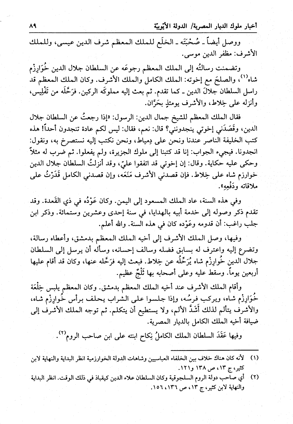 وأقام الملك الأشرف عند أخيه الملك المعظم بدمشق . وكان المعظم يلبس خلعة خوارزم شاه ، ويركب فرسه ، وإذا جلسوا على الشراب يحلف برأس خوارزم شاه ، والأشرف يتألم لذلك أشد الألم ، ولا يستطيع أن يتكلم . ثم توجه الملك الأشرف إلى ضيافة أخيه الملك الكامل بالديار المصرية .
