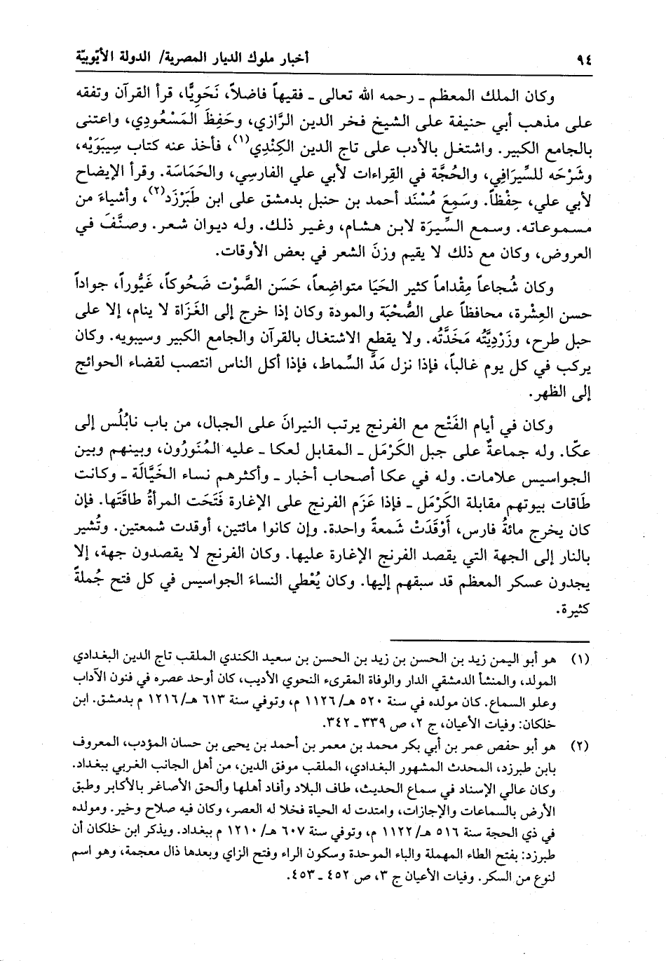 وكان الملك المعظم - رحمه الله تعالى - فقيهاً فاضلاً ، نحوياً ، قرأ القرآن وتفقه على مذهب أبي حنيفة على الشيخ فخر الدين الرازي ، وحفظ المسعودي ، واعتنى بالجامع الكبير . واشتغل بالأدب على تاج الدين الكندي ، فأخذ عنه كتاب سيبويه ، وشرحه للسيرافي ، والحجة في القراءات لأبي على الفارسي ، والحماسة . وقرأ الإيضاح لأبي علي ، حفظاً . وسمع مسند أحمد بن حنبل بدمشق على ابن طبرزد ، وأشياء من مسموعاته . وسمع السيرة لابن هشام ، وغير ذلك . وله ديوان شعر . وصنف في العروض ، وكان مع ذلك لا يقيم وزن الشعر في بعض الأوقات .