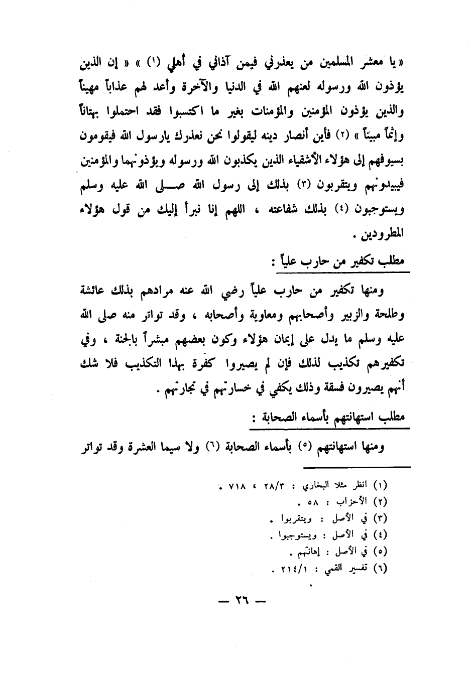 ومنها تكفير من حارب عليا رضي الله عنه مرادهم بذلك عائشة وطلحة والزبير وأصحابهم، ومعاوية وأصحابه. وقد تواتر منه صلى الله عليه وسلم ما يدل على إيمان هؤلاء، وكون بعضهم مبشرا بالجنة، وفي تكفيرهم تكذيب لذلك، فإن لم يصيروا كفرة بهذا التكذيب فلا شك أنهم يصيرون فسقة، وذلك يكفي في خسارتهم في تجارتهم.