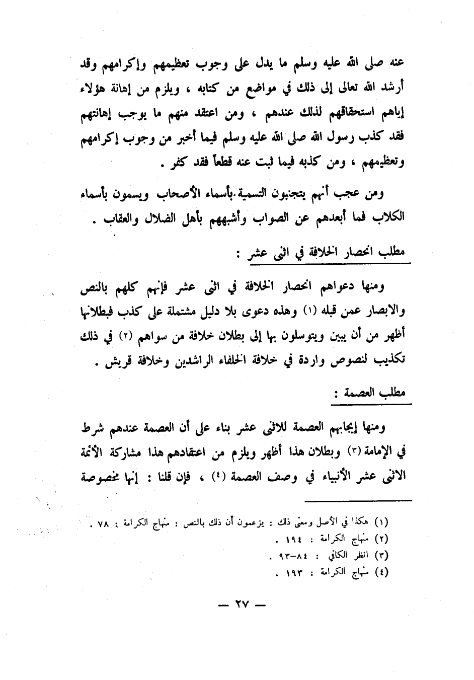 ومنها إيجابهم العصمة للاثني عشر بناء على أن العصمة عندهم شرط في الإمامة 3؛ وبطلان هذا أظهر، ويلزم من اعتقادهم هذا مشاركة الأئمة الاثني عشر الأنبياء في وصف العصمة4. فإن قلنا: إنها مخصوصة