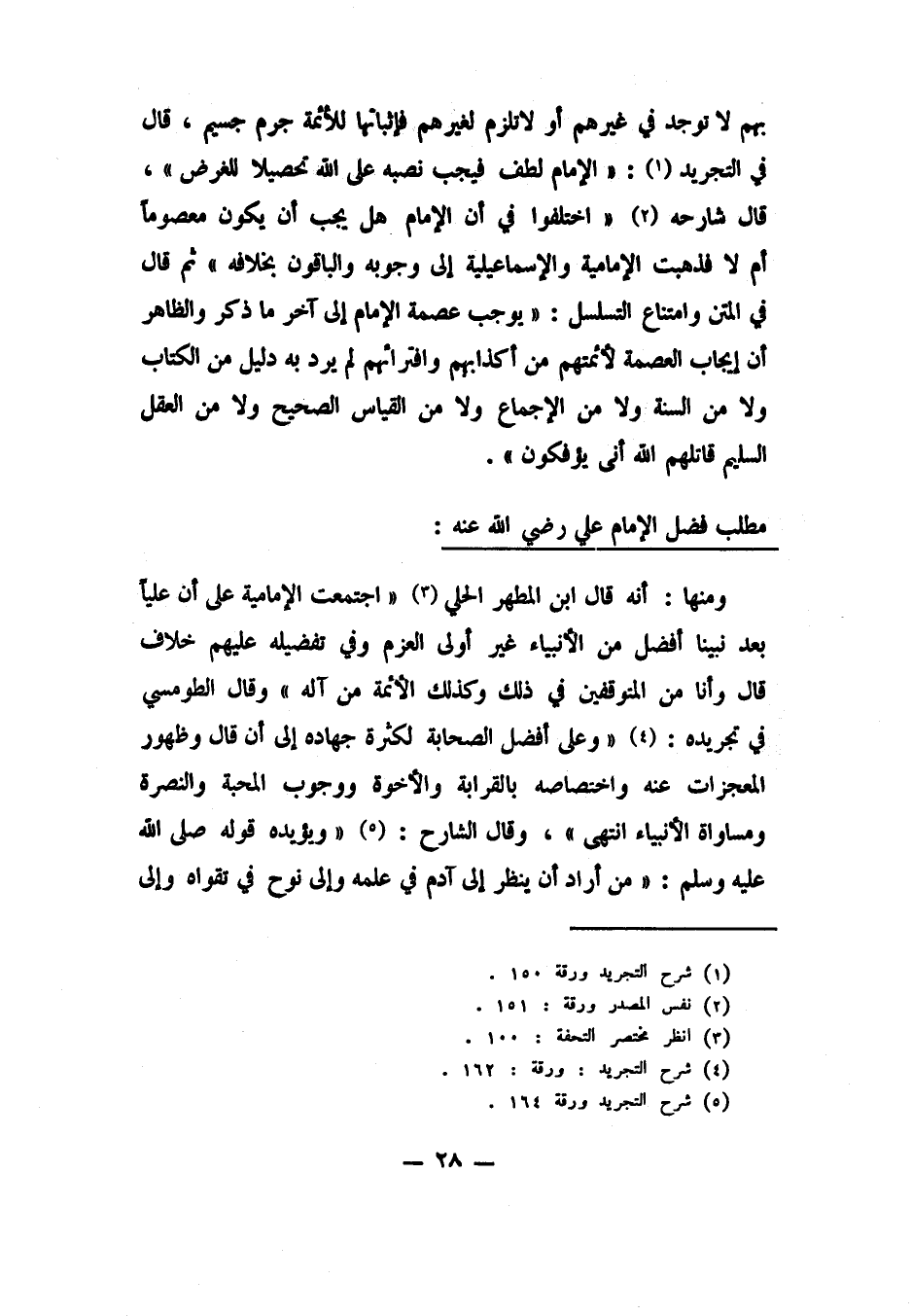 ومنها: أنه قال ابن المطهر الحلي 3 ": اجتمعت الإمامية على أن عليا بعد نبينا أفضل من الأنبياء غير أولي العزم، وفي تفضيله عليهم خلاف، قال وأنا من المتوقفين في ذلك وكذلك الأئمة من آله " وقال الطومسي في تجريده: 4"وعلي أفضل الصحابة لكثرة جهاده، إلى أن قال: وظهور المعجزات عنه واختصاصه بالقرابة والأخوة ووجوب المحبة والنصرة ومساواة الأنبياء. انتهى ". وقال الشارح: 5 " ويؤيده قوله صلى الله عليه وسلم: "من أراد أن ينظر إلى آدم في علمه، وإلى نوح في تقواه، وإلى
