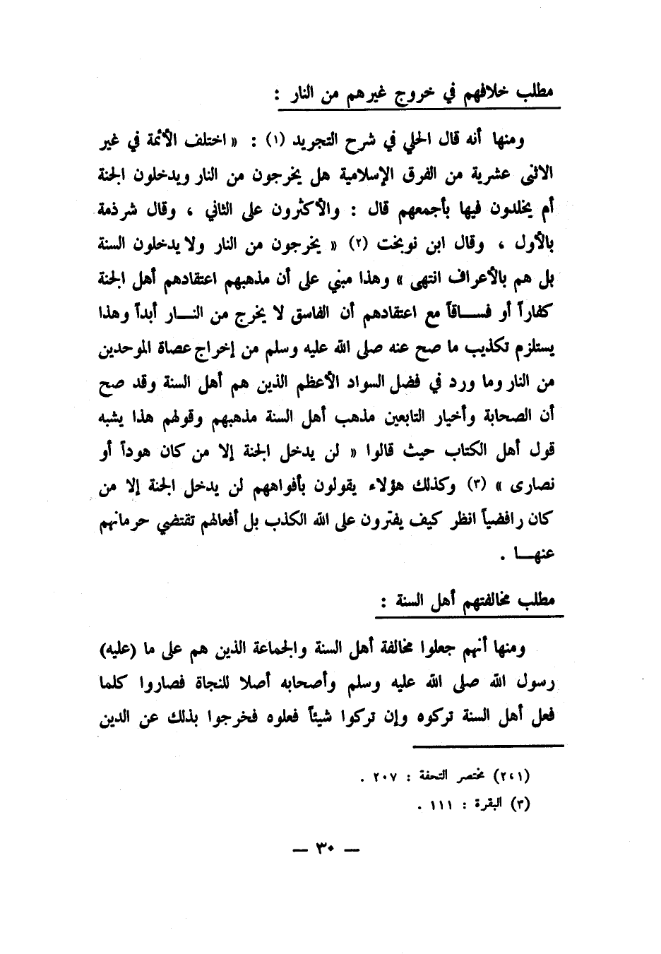 ومنها أنه قال الحلي في شرح التجريد 1: " اختلف الأئمة في غير الاثنى عشرية من الفرق الإسلامية، هل يخرجون من النار ويدخلون الجنة أم يخلدون فيها بأجمعهم؟ قال: والأكثرون على الثاني، وقال شرذمة بالأول، وقال ابن نوبخت 2: " يخرجون من النار ولا يدخلون الجنة، بل هم بالأعراف. انتهى ". وهذا مبني على أن مذهبهم اعتقادهم أهل السنة كفارا أو فساقا، مع اعتقادهم أن الفاسق لا يخرج من النار أبدا؛ وهذا يستلزم تكذيب ما صح عنه صلى الله عليه وسلم من إخراج عصاة الموحدين من النار، وما ورد في فضل السواد الأعظم الذين هم أهل السنة. وقد صح أن الصحابة وأخيار التابعين مذهب أهل السنة مذهبهم، وقولهم هذا يشبه قول أهل الكتاب، حيث قالوا: {لَنْ يَدْخُلَ الْجَنَّةَ إِلَّا مَنْ كَانَ هُوداً} 3، وكذلك هؤلاء يقولون بأفواههم: لن يدخل الجنة إلا من كان رافضيا. انظر كيف يفترون على الله الكذب، بل أفعالهم تقتضي حرمانهم عنها.