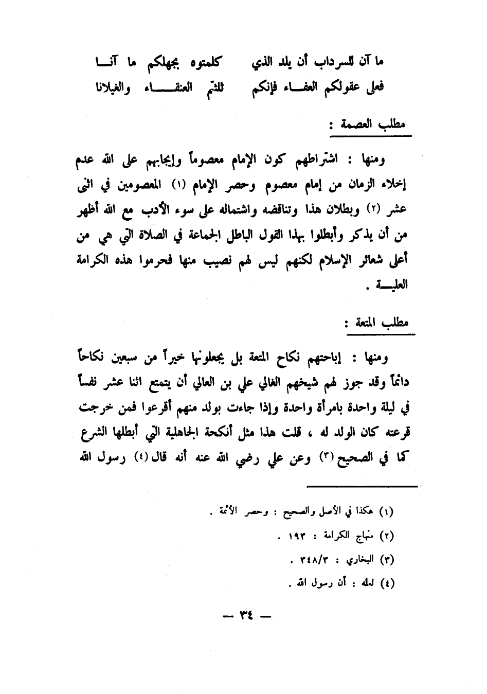 ومنها: اشتراطهم كون الإمام معصوما، وإيجابهم على الله عدم إخلاء الزمان من إمام معصوم، وحصر الإمام 1 المعصومين في اثني عشر 2؛ وبطلان هذا وتناقضه واشتماله على سوء الأدب مع الله أظهر من أن يذكر. وأبطلوا بهذا القول الباطل الجماعة في الصلاة التي هي من أعلى شعائر الإسلام، لكنهم ليس لهم نصيب منها، فحرموا هذه الكرامة العلية.