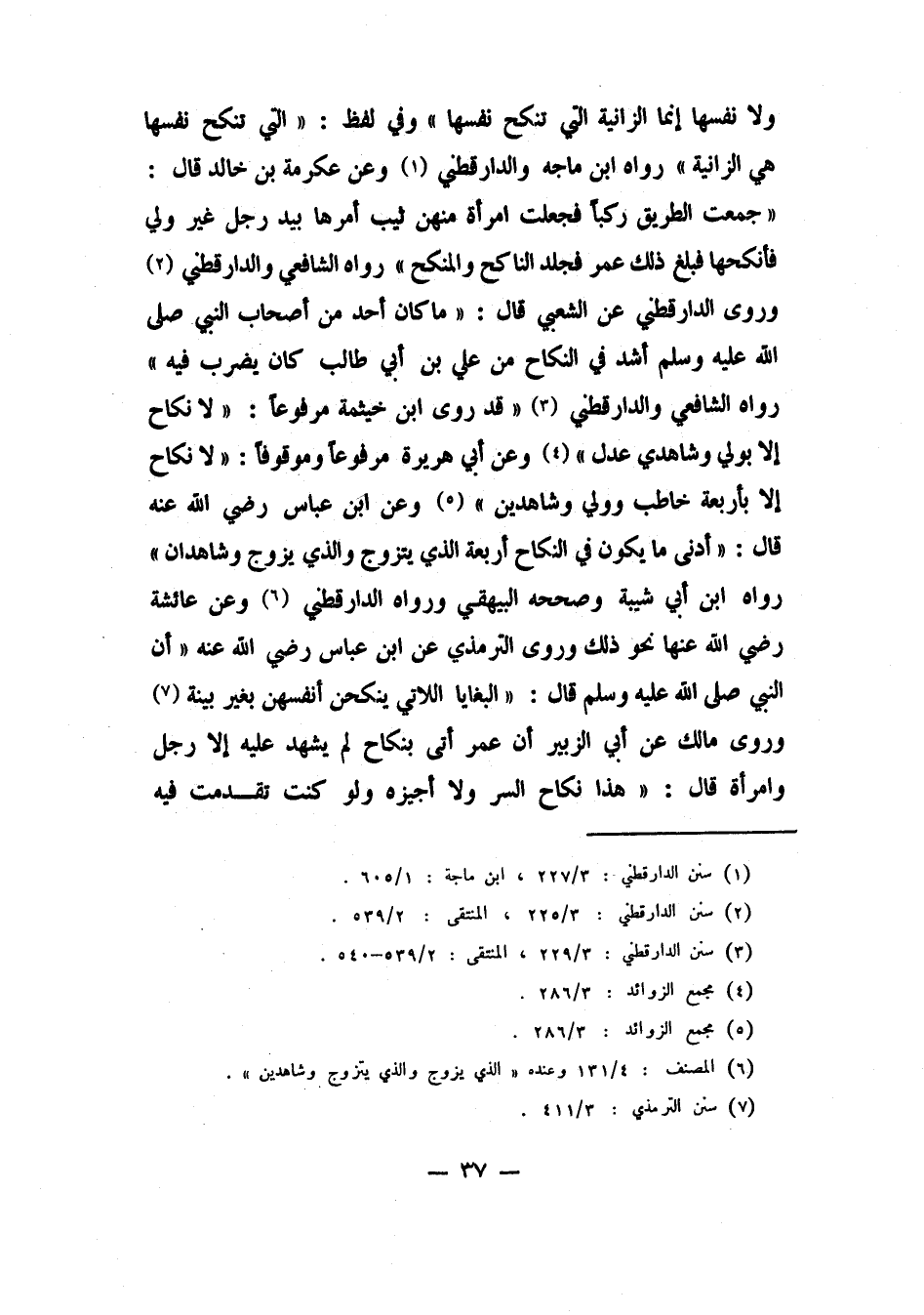 وفي لفظ: "التي تنكح نفسها هي الزانية" رواه ابن ماجه والدارقطني. 1 وعن عكرمة بن خالد قال: "جمعت الطريق ركبا، فجعلت امرأة منهن ثيب أمرها بيد رجل غير ولي، فأنكحها، فبلغ ذلك عمر، فجلد الناكح والمنكح" رواه الشافعي والدارقطني 2. وروى الدارقطني عن الشعبي قال: "ما كان أحد من أصحاب النبي صلى الله عليه وسلم أشد في النكاح من علي بن أبي طالب، كان يضرب فيه" رواه الشافعي والدارقطني 3. قد روى ابن خيثمة مرفوعا: "لا نكاح إلا بولي وشاهدي عدل 4" وعن أبي هريرة مرفوعا وموقوفا: "لا نكاح إلا بأربعة: خاطب وولي وشاهدين 5") . وعن ابن عباس رضي الله عنه قال: "أدنى ما يكون في النكاح أربعة: الذي يتزوج، والذي يزوج، وشاهدان" رواه ابن أبي شيبة وصححه البيهقي ورواه الدارقطني 6. وعن عائشة رضي الله عنها نحو ذلك. وروى الترمذي عن ابن عباس رضي الله عنه أن النبي صلى الله عليه وسلم قال: "البغايا اللاتي ينكحن أنفسهن بغير بينة 7". وروى مالك عن أبي الزبير أن عمر أتي بنكاح لم يشهد عليه إلا رجل وامرأة قال: "هذا نكاح السر، ولا أجيزه، ولو كنت تقدمت فيه