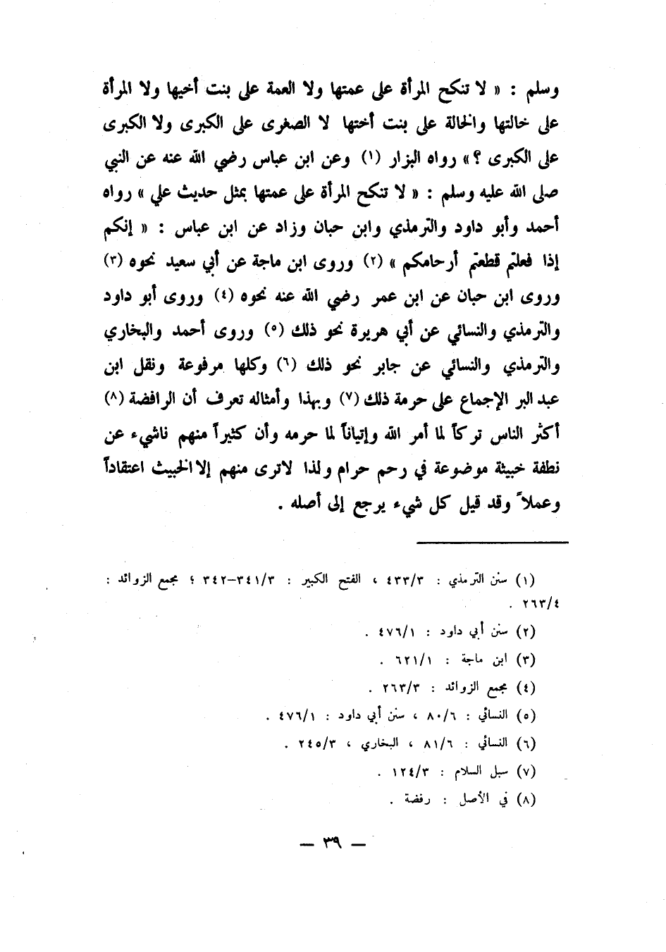 وسلم: "لا تنكح المرأة على عمتها، ولا العمة على بنت أخيها، ولا المرأة على خالتها، والخالة على بنت أختها، لا الصغرى على الكبرى، ولا الكبرى على الصغرى " 1 رواه البزار 2. وعن ابن عباس رضي الله عنه عن النبي صلى الله عليه وسلم: "لا تنكح المرأة على عمتها" 3 بمثل حديث علي، رواه أحمد وأبو داود والترمذي وابن حبان، وزاد عن ابن عباس: "إنكم إذا فعلتم قطعتم أرحامكم 4") وروى ابن ماجة عن أبي سعيد نحوه 5. وروى ابن حبان عن ابن عمر رضي الله عنه نحوه6. وروى أبو داود والترمذي والنسائي عن أبي هريرة نحو ذلك 7. وروى أحمد والبخاري والترمذي والنسائي عن جابر نحو ذلك8. وكلها مرفوعة. ونقل ابن عبد البر الإجماع على حرمة ذلك9. وبهذا وأمثاله تعرف أن الرافضة 10 أكثر الناس تركا لما أمر الله، وإتيانا لما حرمه، وأن كثيرا منهم ناشئ عن نطفة خبيثة موضوعة في رحم حرام، ولذا لا ترى منهم إلا الخبيث اعتقادا وعملا، وقد قيل كل شيء يرجع إلى أصله.