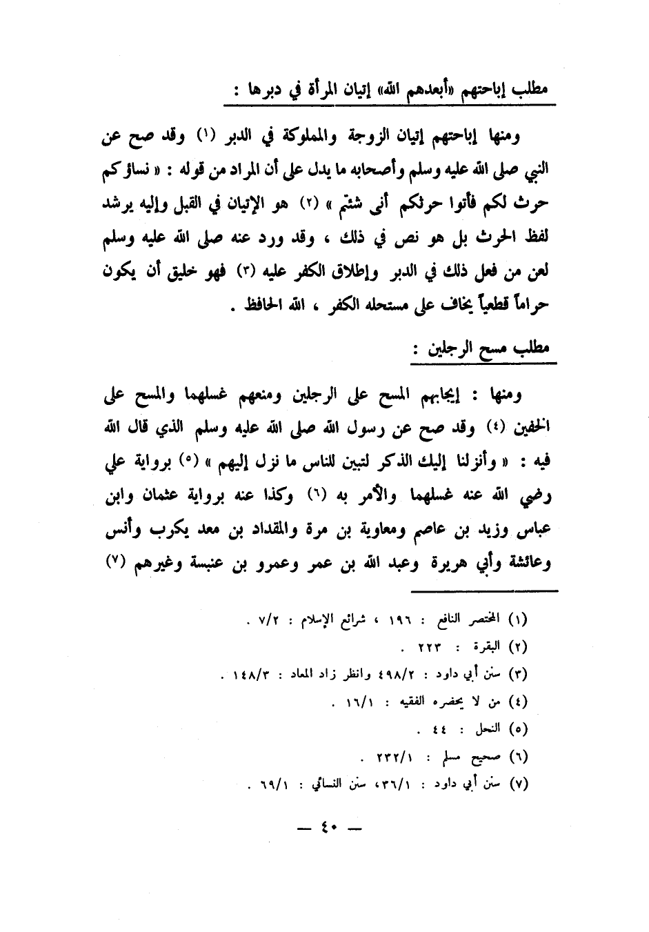 ومنها إباحتهم إتيان الزوجة والمملوكة في الدبر، 1 وقد صح عن النبي صلى الله عليه وسلم وأصحابه ما يدل على أن المراد من قوله: {نِسَاؤُكُمْ حَرْثٌ لَكُمْ فَأْتُوا حَرْثَكُمْ أَنَّى شِئْتُمْ} 2 هو الإتيان في القبل، وإليه يرشد لفظ الحرث، بل هو نص في ذلك، وقد ورد عنه صلى الله عليه وسلم لعن من فعل ذلك في الدبر، وإطلاق الكفر عليه 3؛ فهو خليق أن يكون حراما قطعيا، يخاف على مستحله الكفر، الله الحافظ.