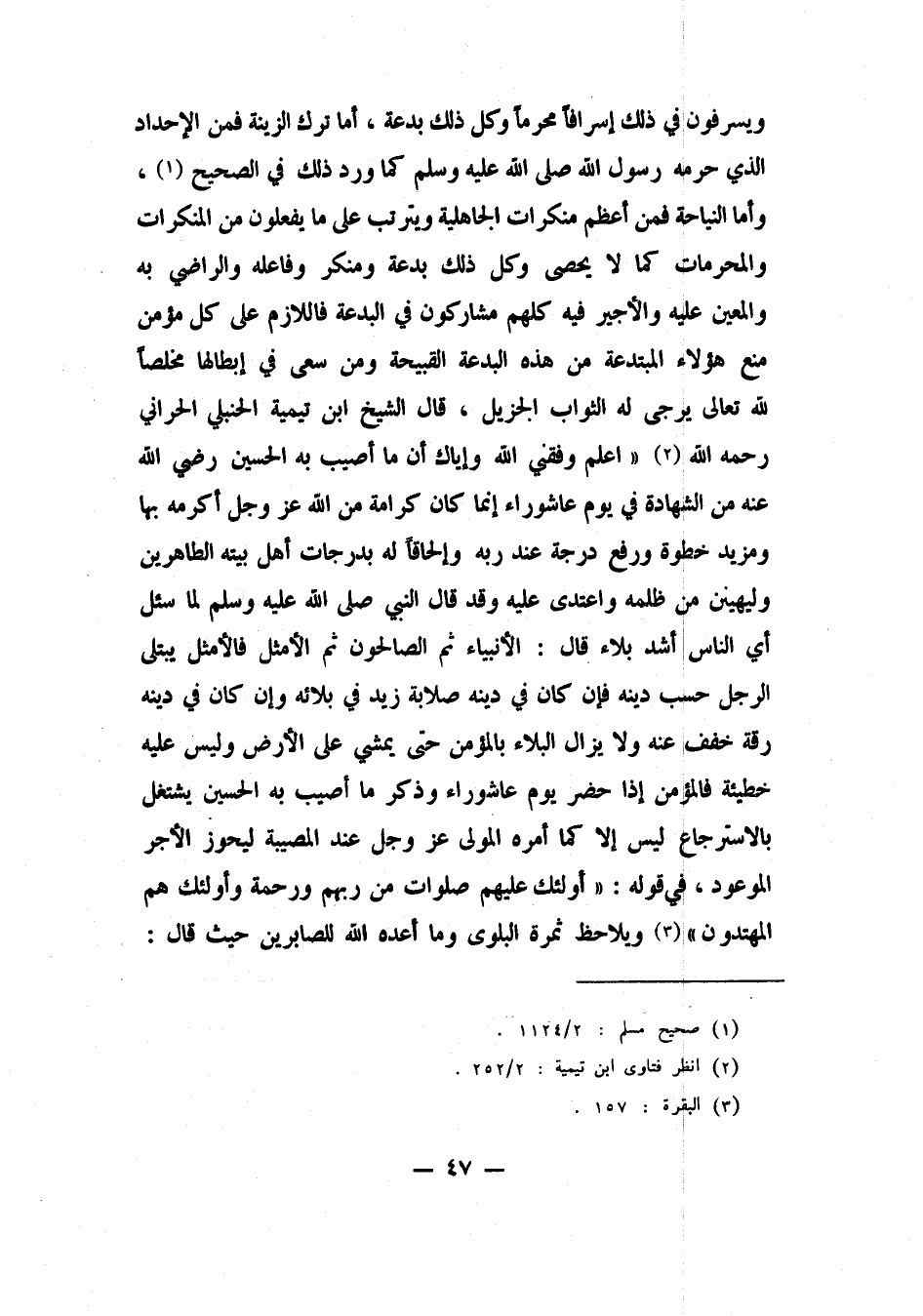 قال الشيخ ابن تيمية الحنبلي الحراني رحمه الله: 2 " اعلم وفقني الله وإياك أن ما أصيب به الحسين رضي الله عنه من الشهادة في يوم عاشوراء إنما كان كرامة من الله (أكرمه بها، ومزيد حظوة، ورفع درجة عند ربه، وإلحاقا له بدرجات أهل بيته الطاهرين، وليهينن من ظلمه واعتدى عليه، وقد قال النبي صلى الله عليه وسلم لما سئل أي الناس أشد بلاء قال: "الأنبياء، ثم الصالحون، ثم الأمثل فالأمثل، يبتلى الرجل حسب دينه، فإن كان في دينه صلابة زيد في بلائه، وإن كان في دينه رقة خفف عنه. ولا يزال البلاء بالمؤمن حتى يمشي على الأرض وليس عليه خطيئة" 3. فالمؤمن إذا حضر يوم عاشوراء وذكر ما أصيب به الحسين يشتغل بالاسترجاع، ليس إلا، كما أمره المولى (عند المصيبة، ليحوز الأجر الموعود، في قوله: {أُولَئِكَ عَلَيْهِمْ صَلَوَاتٌ مِنْ رَبِّهِمْ وَرَحْمَةٌ وَأُولَئِكَ هُمُ الْمُهْتَدُونَ} 4، ويلاحظ ثمرة البلوى، وما أعده الله للصابرين حيث قال: