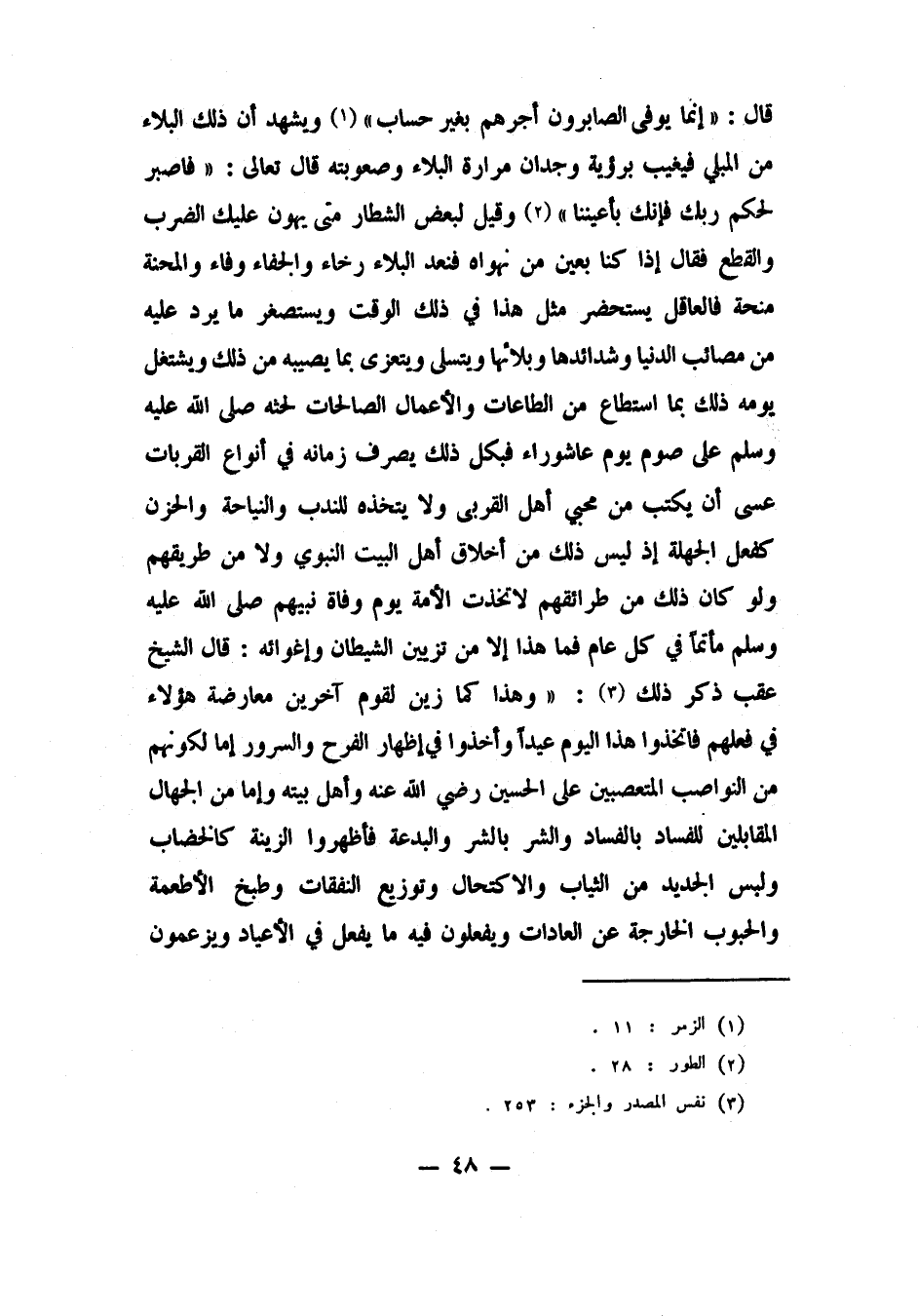 {إِنَّمَا يُوَفَّى الصَّابِرُونَ أَجْرَهُمْ بِغَيْرِ حِسَابٍ} 1، ويشهد أن ذلك البلاء من المبلي فيغيب برؤية وجدان مرارة البلاء وصعوبته قال تعالى: {وَاصْبِرْ لِحُكْمِ رَبِّكَ فَإِنَّكَ بِأَعْيُنِنَا} 2. وقيل لبعض الشطار: متى يهون عليك الضرب والقطع؟ فقال: إذا كنا بعين من نهواه، فنعد البلاء رخاء والجفاء وفاء والمحنة منحة. فالعاقل يستحضر مثل هذا في ذلك الوقت، ويستصغر ما يرد عليه من مصائب الدنيا وشدائدها وبلائها، ويتسلى ويتعزى بما يصيبه من ذلك، ويشتغل يومه ذلك بما استطاع من الطاعات والأعمال الصالحات، لحثه صلى الله عليه وسلم على صوم يوم عاشوراء؛ فبكل ذلك يصرف زمانه في أنواع القربات عسى أن يكتب من محبي أهل القربى، ولا يتخذه للندب والنياحة والحزن كفعل الجهلة، إذ ليس ذلك من أخلاق أهل البيت النبوي ولا من طريقهم، ولو كان ذلك من طرائقهم لاتخذت الأمة يوم وفاة نبيهم صلى الله عليه وسلم مأتما في كل عام؛ فما هذا إلا من تزيين الشيطان وإغوائه".