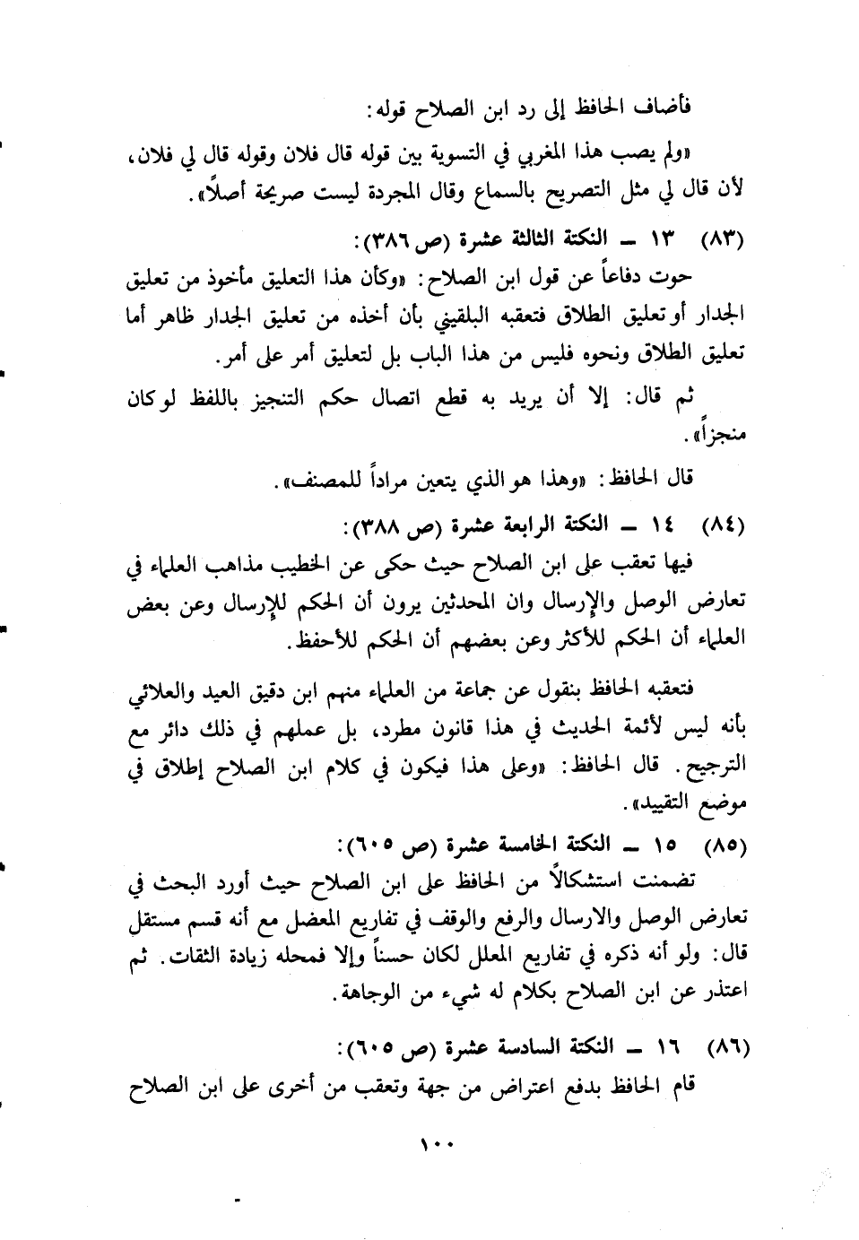 فيها تعقب عن ابن الصلاح حيث حكى عن الخطيب مذاهب العلماء في تعارض الوصل والإرسال وأن المحدثين يرون أن الحكم للإرسال، وعن بعض العلماء أن الحكم للأكثر، وعن بعضهم أن الحكم للأحفظ.